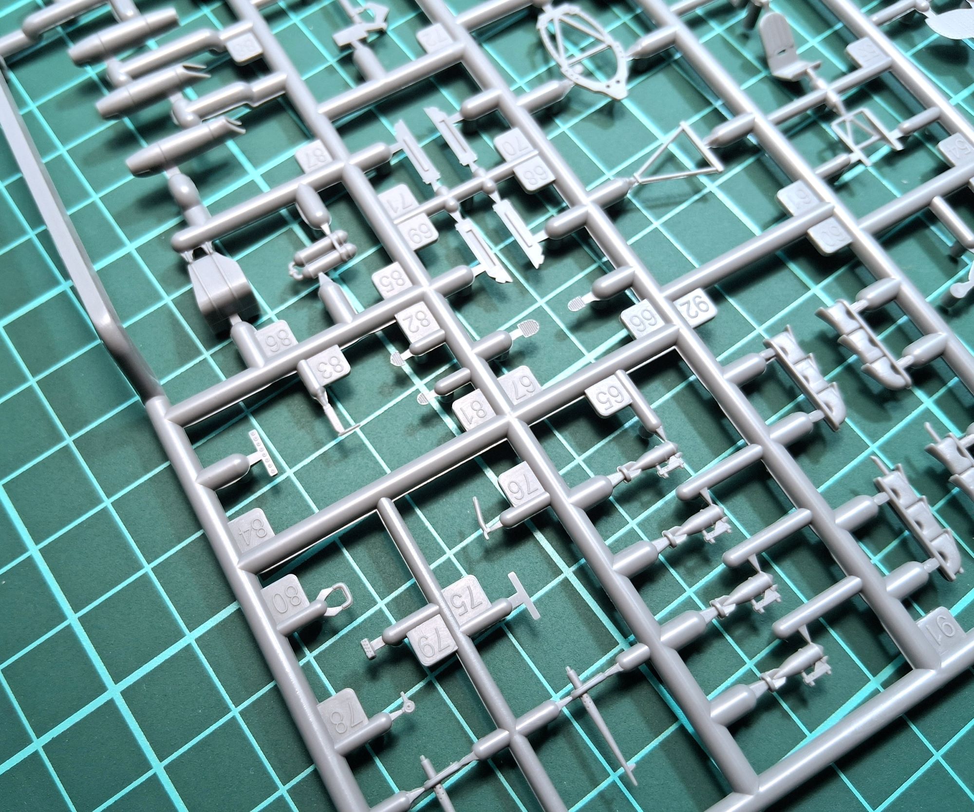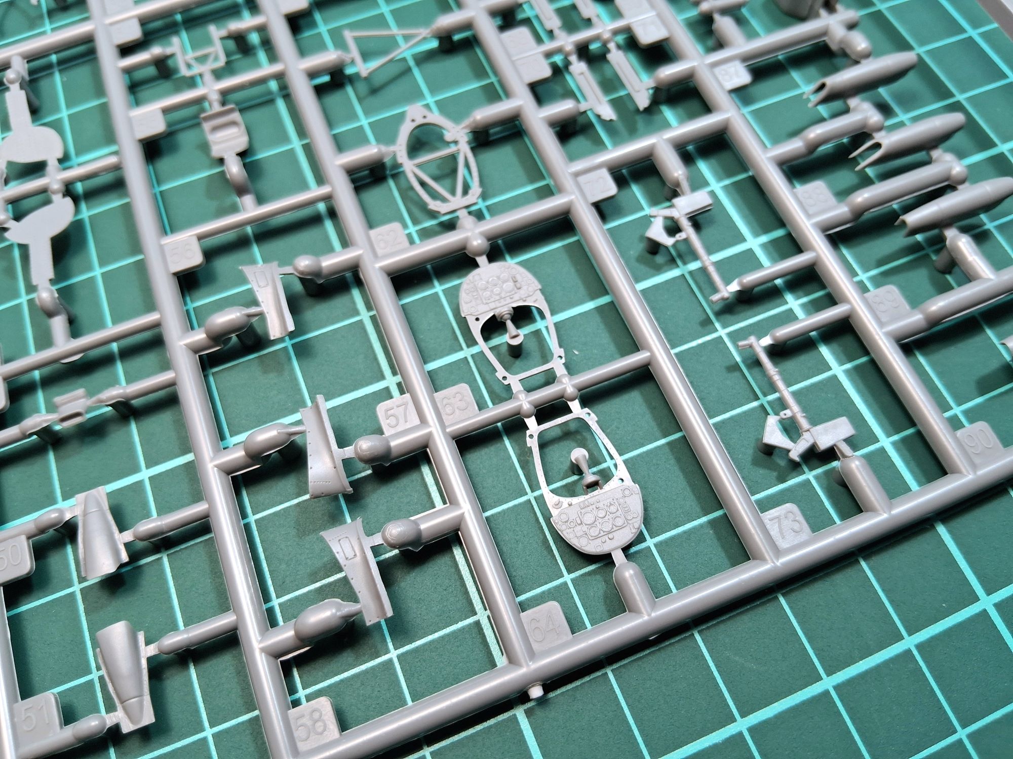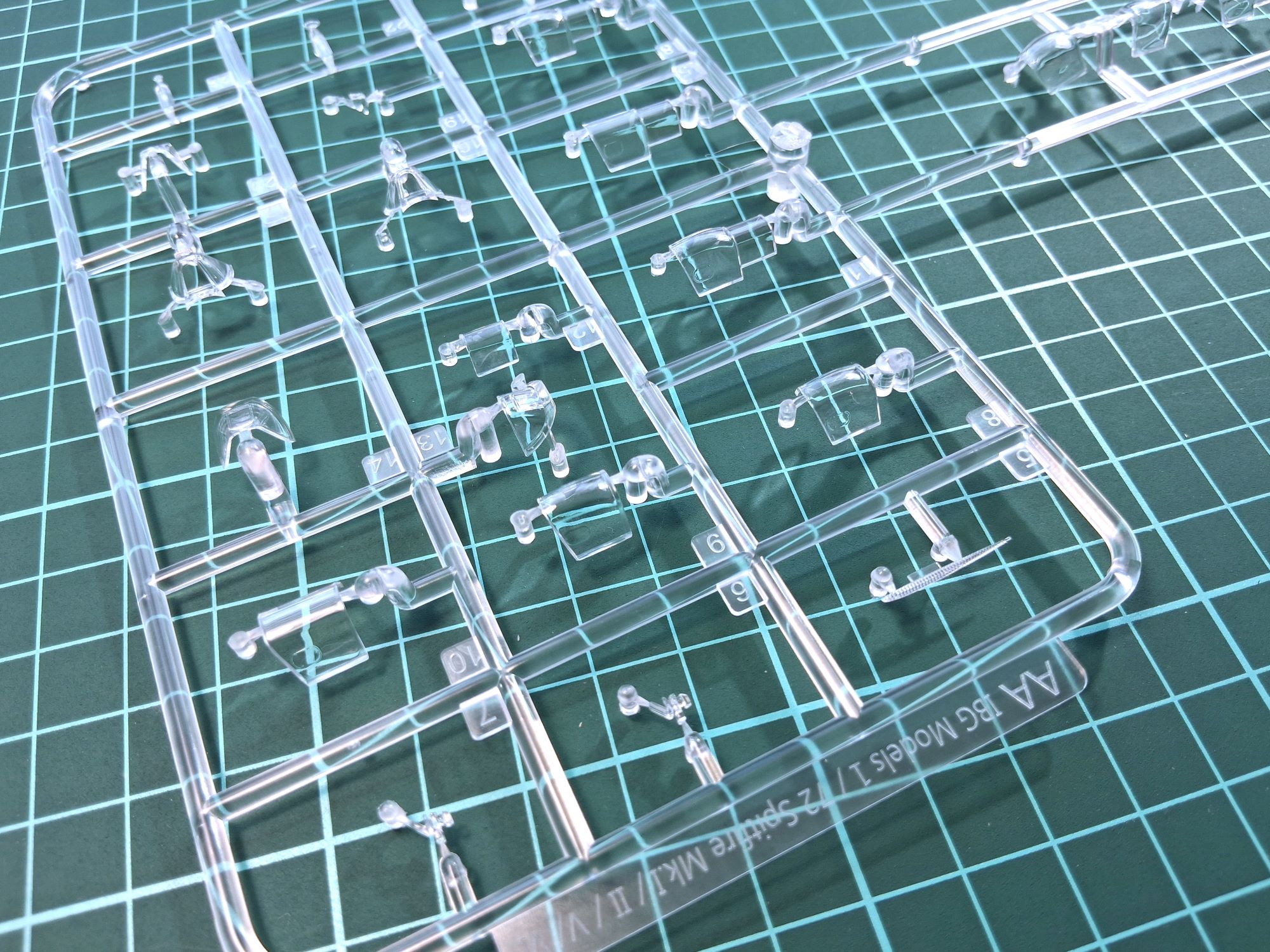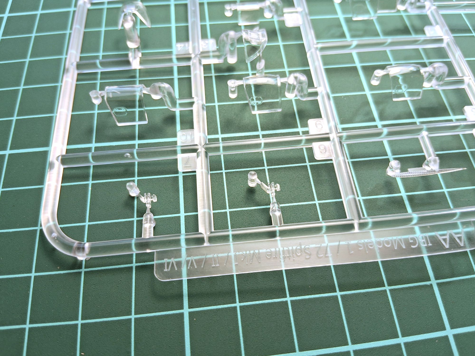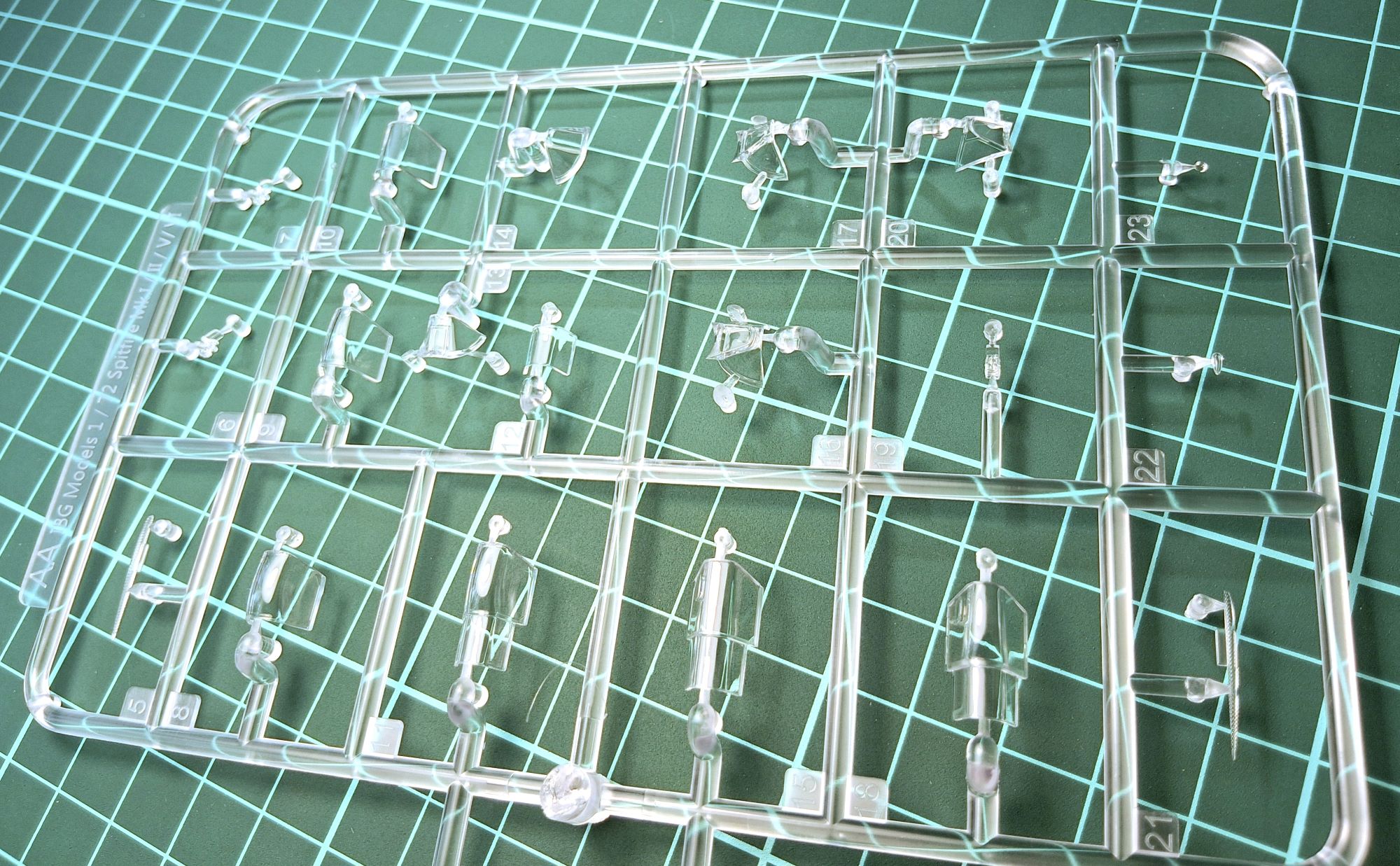 rámeček s čirými díly obsahuje řadu překrytů a variant čelních štítků, hlavní část je v pohodě mezi čirými díly jsou i dva typy GM-2 zaměřovačů, gyro zaměřovač, zkrácené oblouky křídla atp.