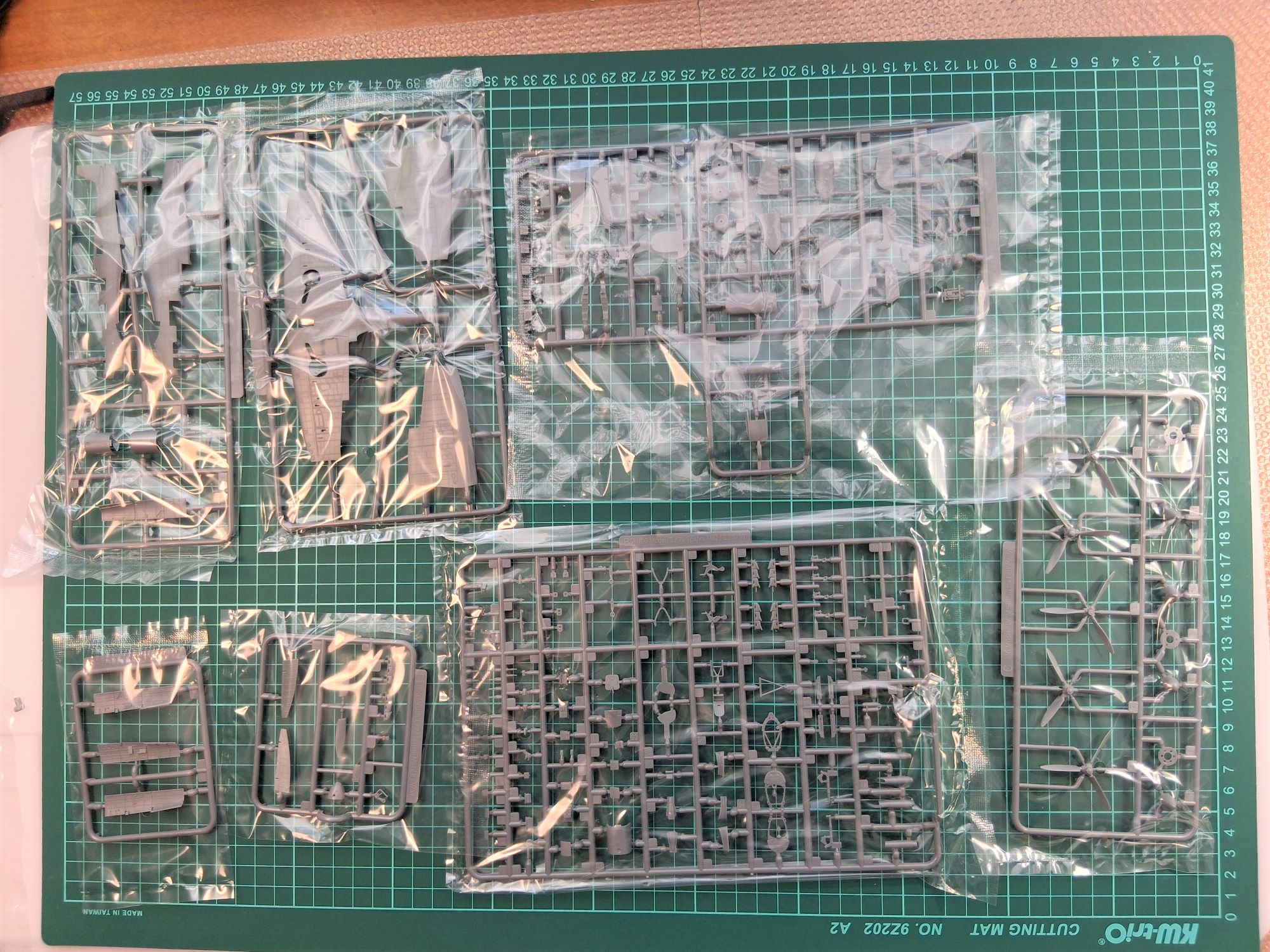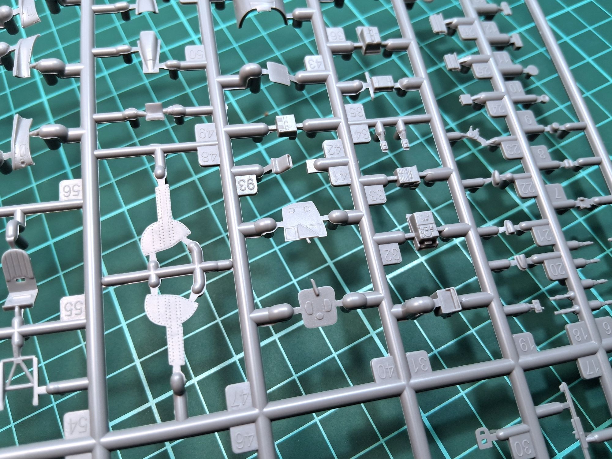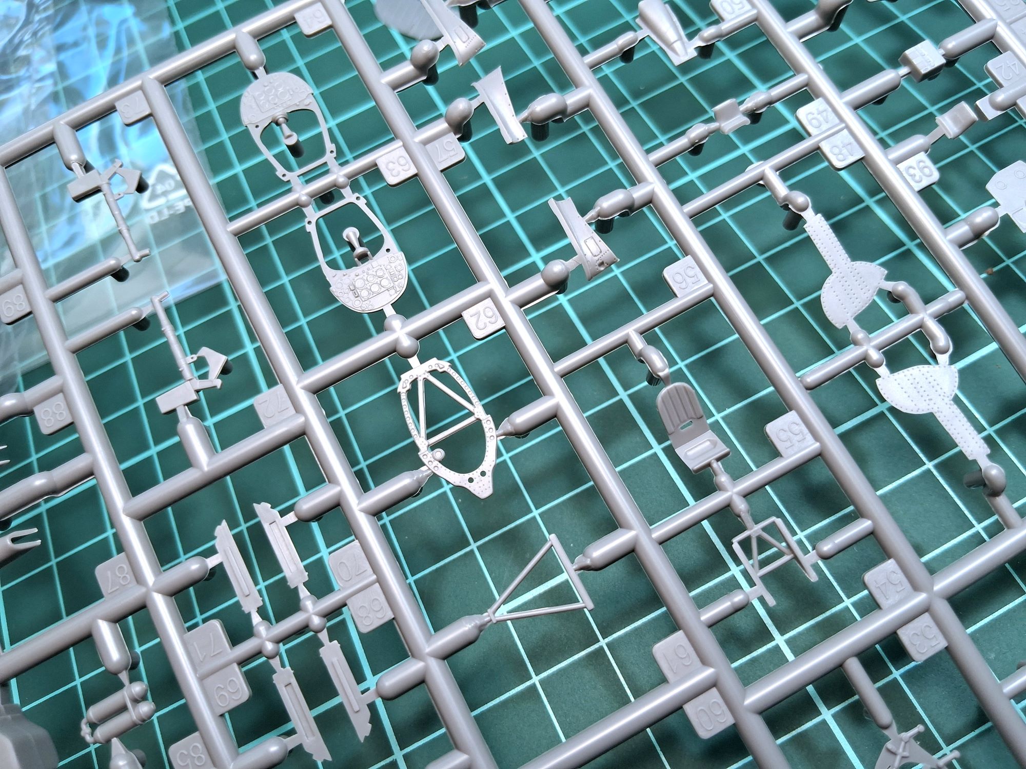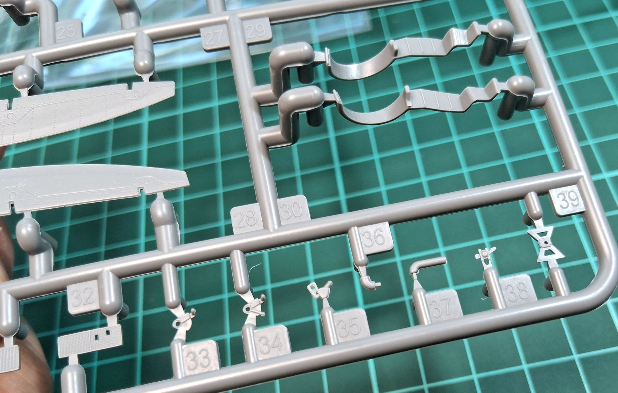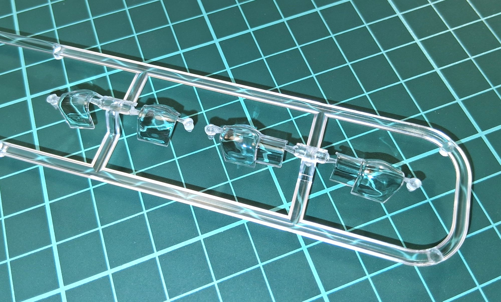 rámeček s čirými díly obsahuje řadu překrytů a variant čelních štítků, hlavní část je v pohodě mezi čirými díly jsou i dva typy GM-2 zaměřovačů, gyro zaměřovač, zkrácené oblouky křídla atp.