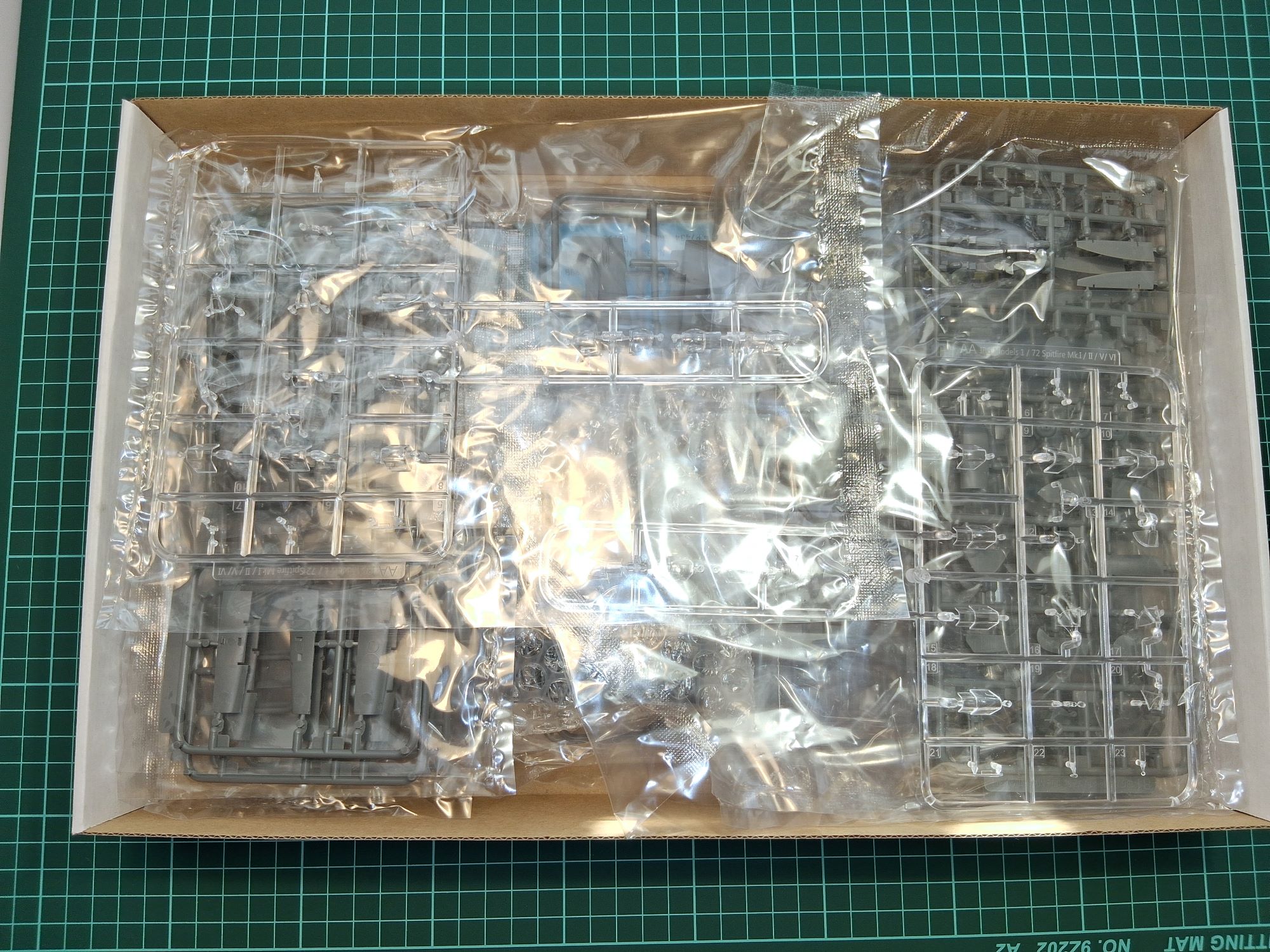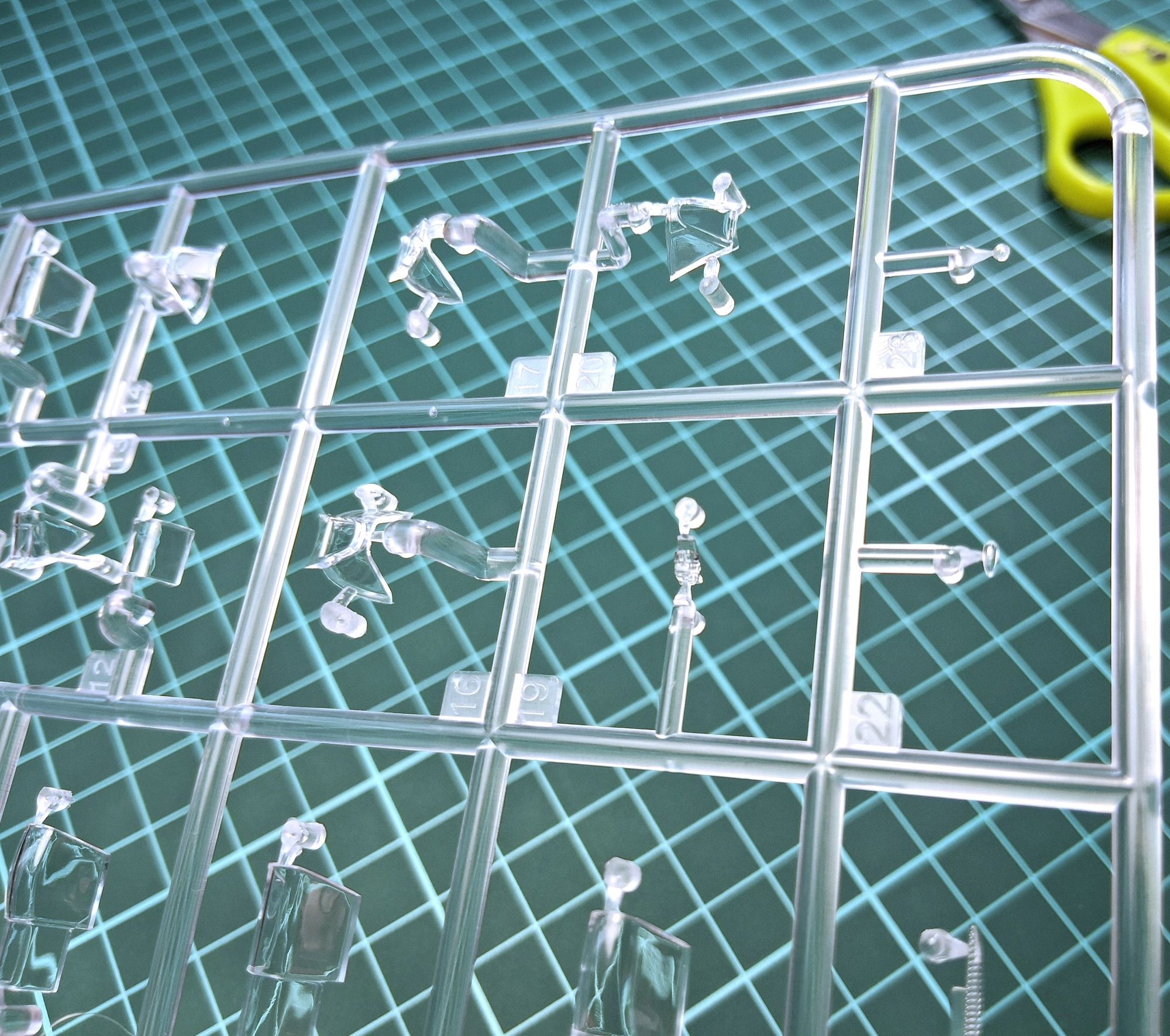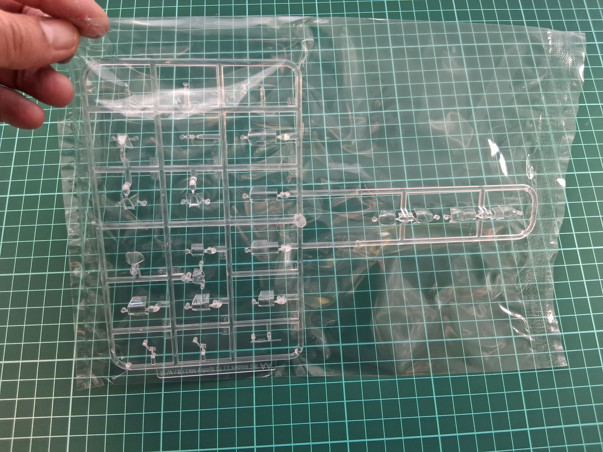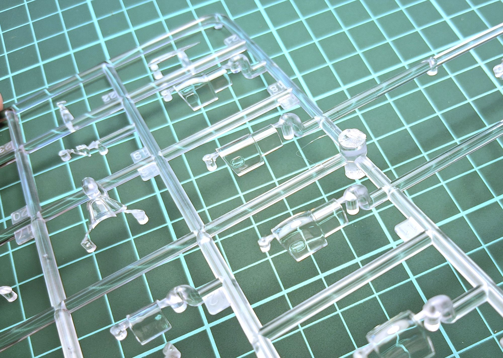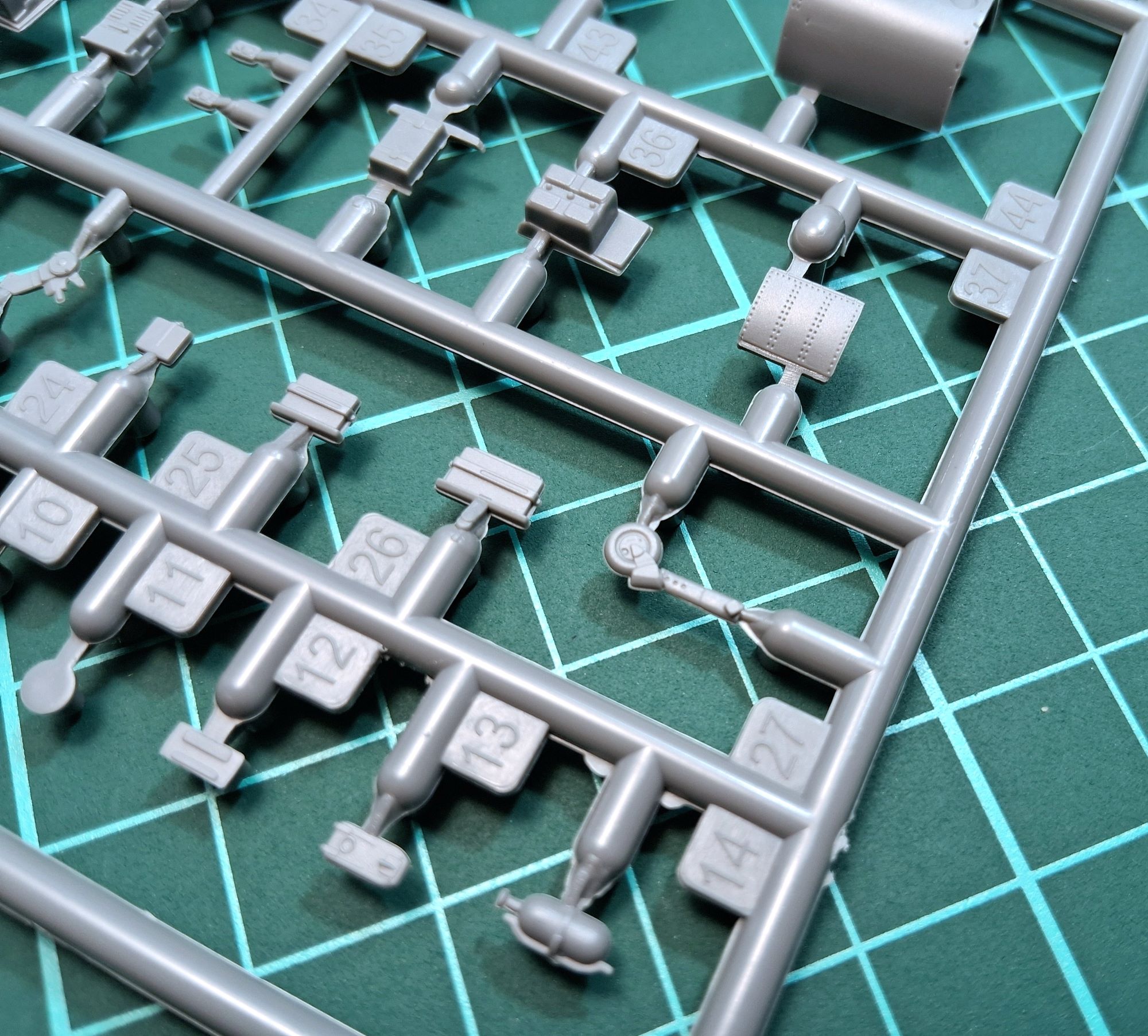 rámeček s čirými díly obsahuje řadu překrytů a variant čelních štítků, hlavní část je v pohodě mezi čirými díly jsou i dva typy GM-2 zaměřovačů, gyro zaměřovač, zkrácené oblouky křídla atp.