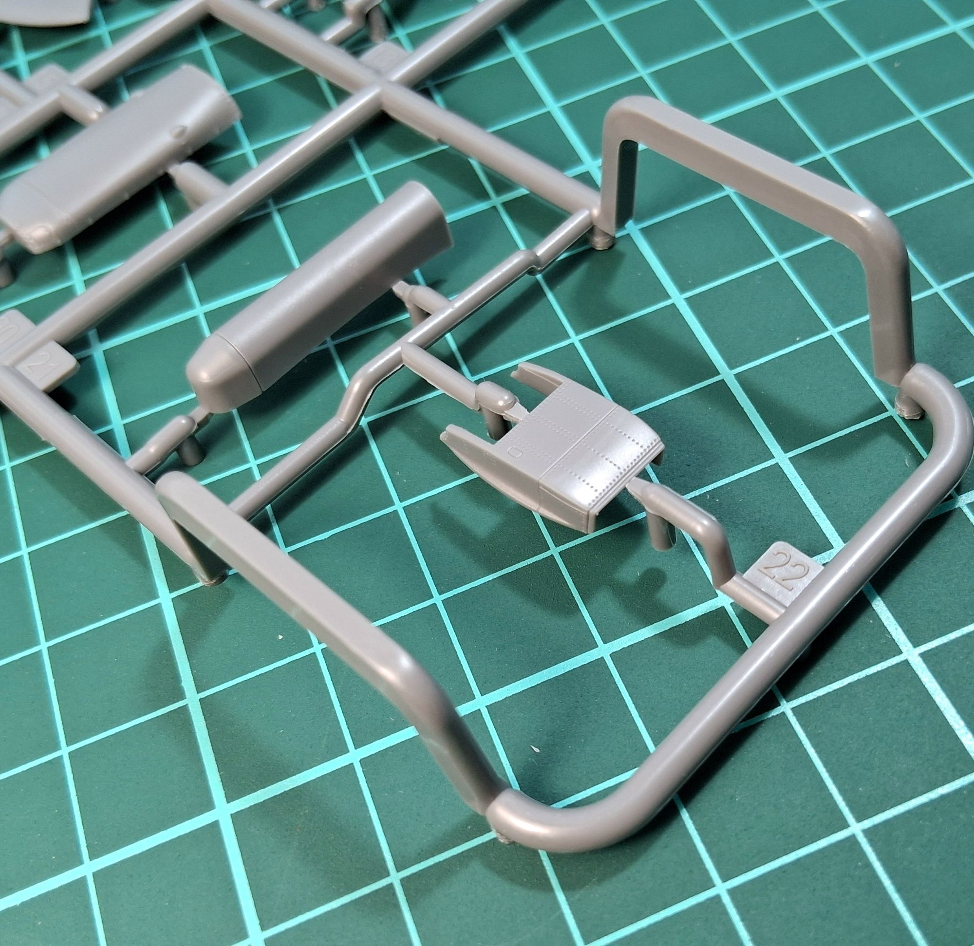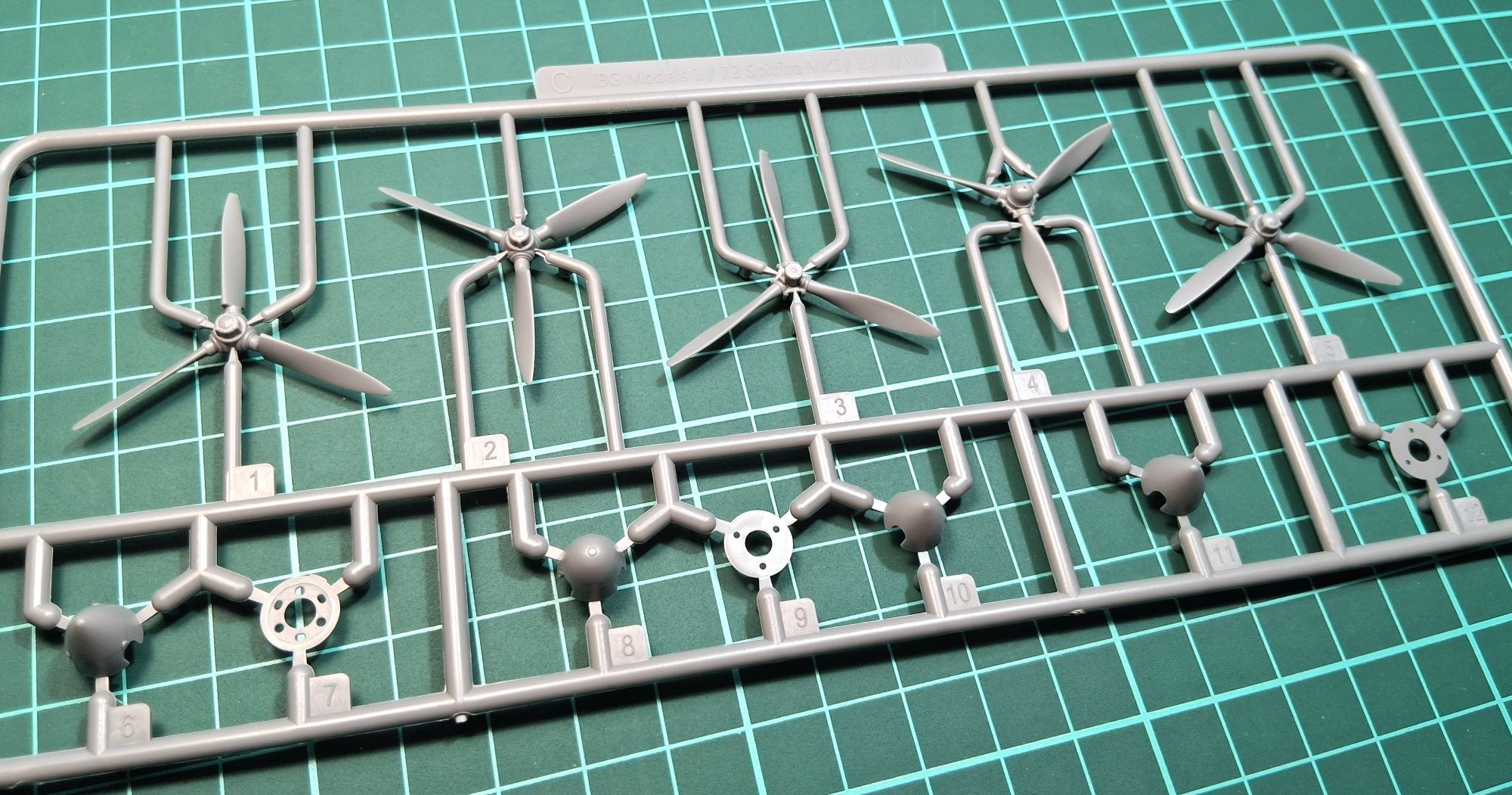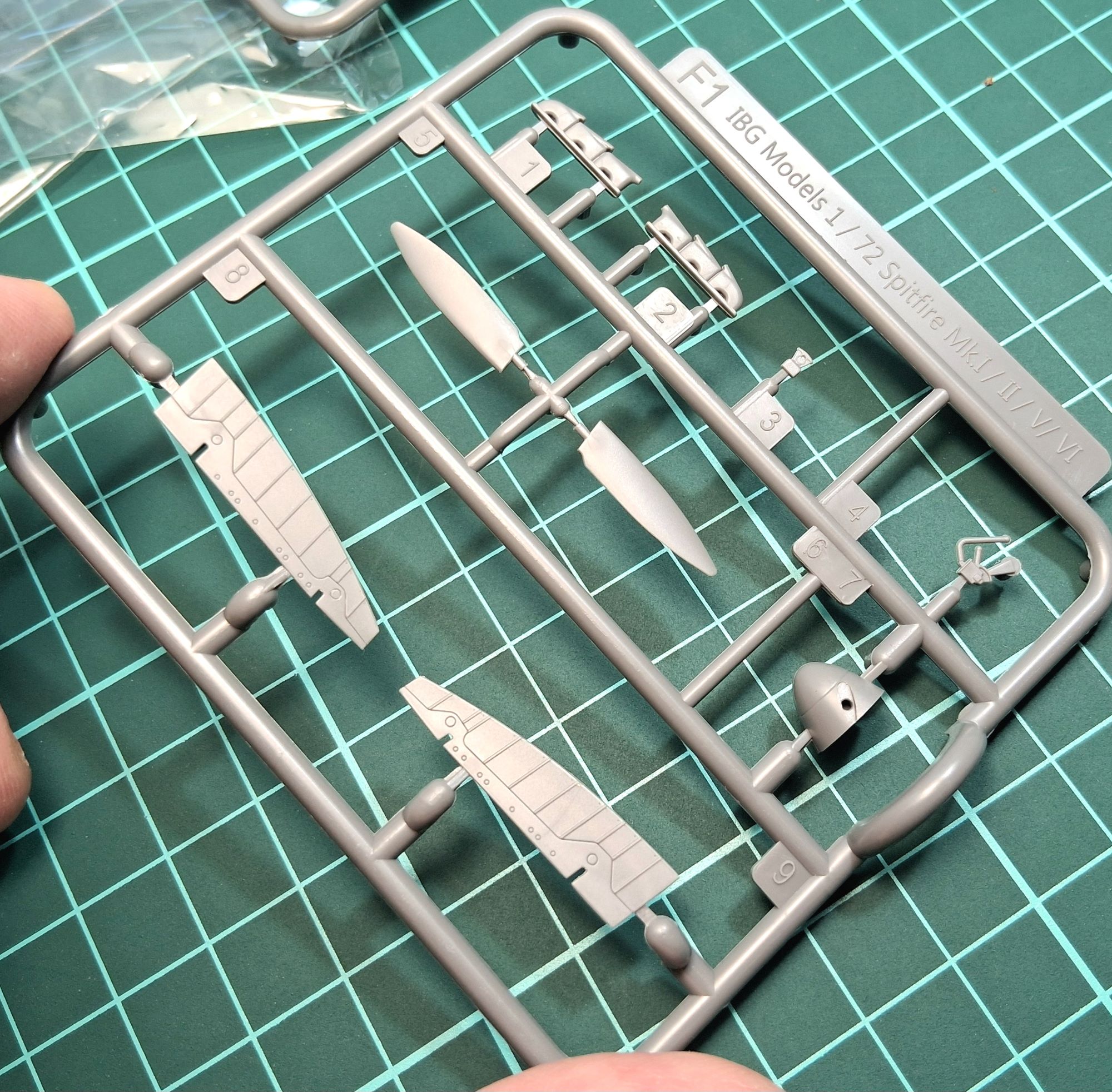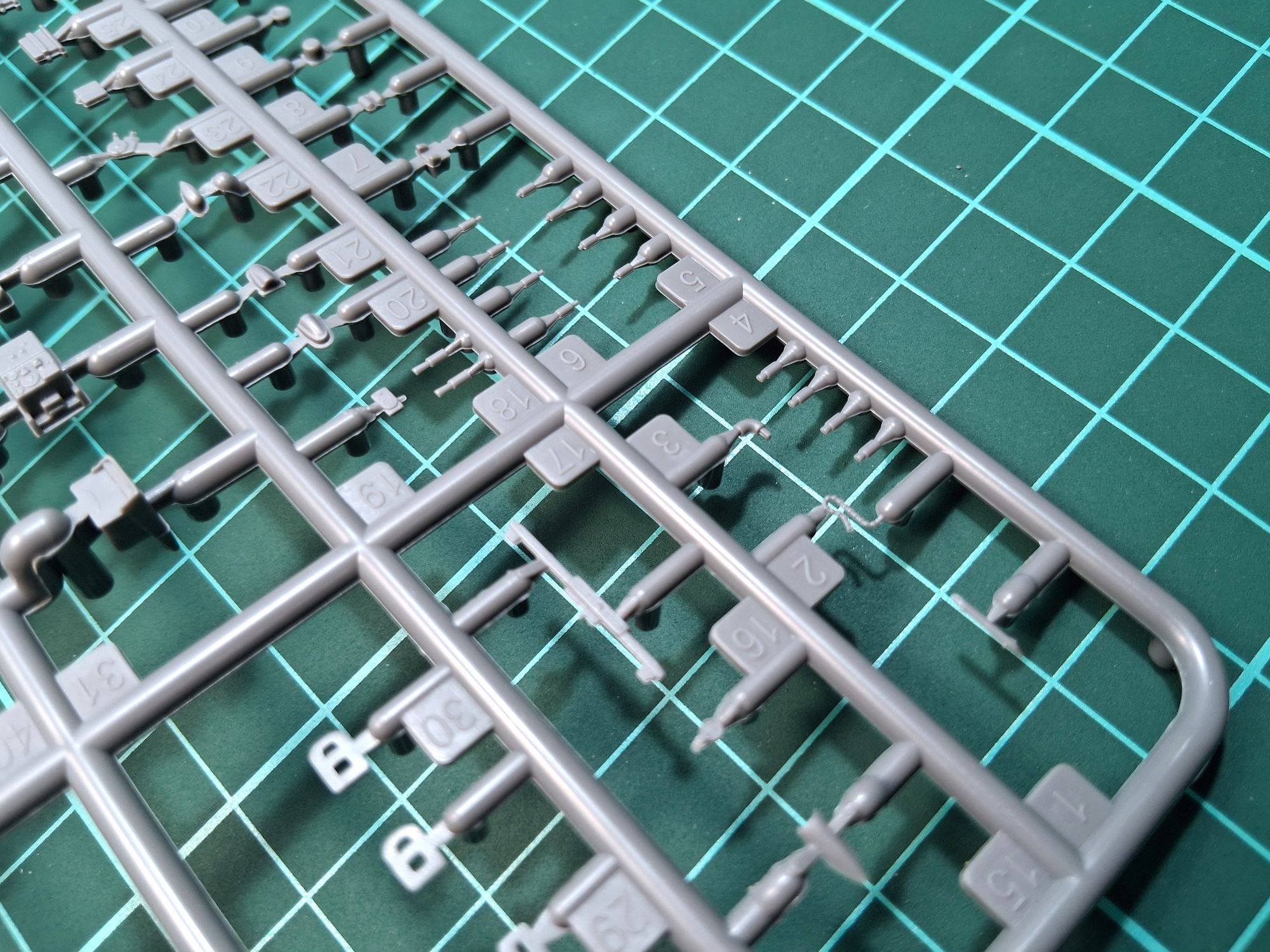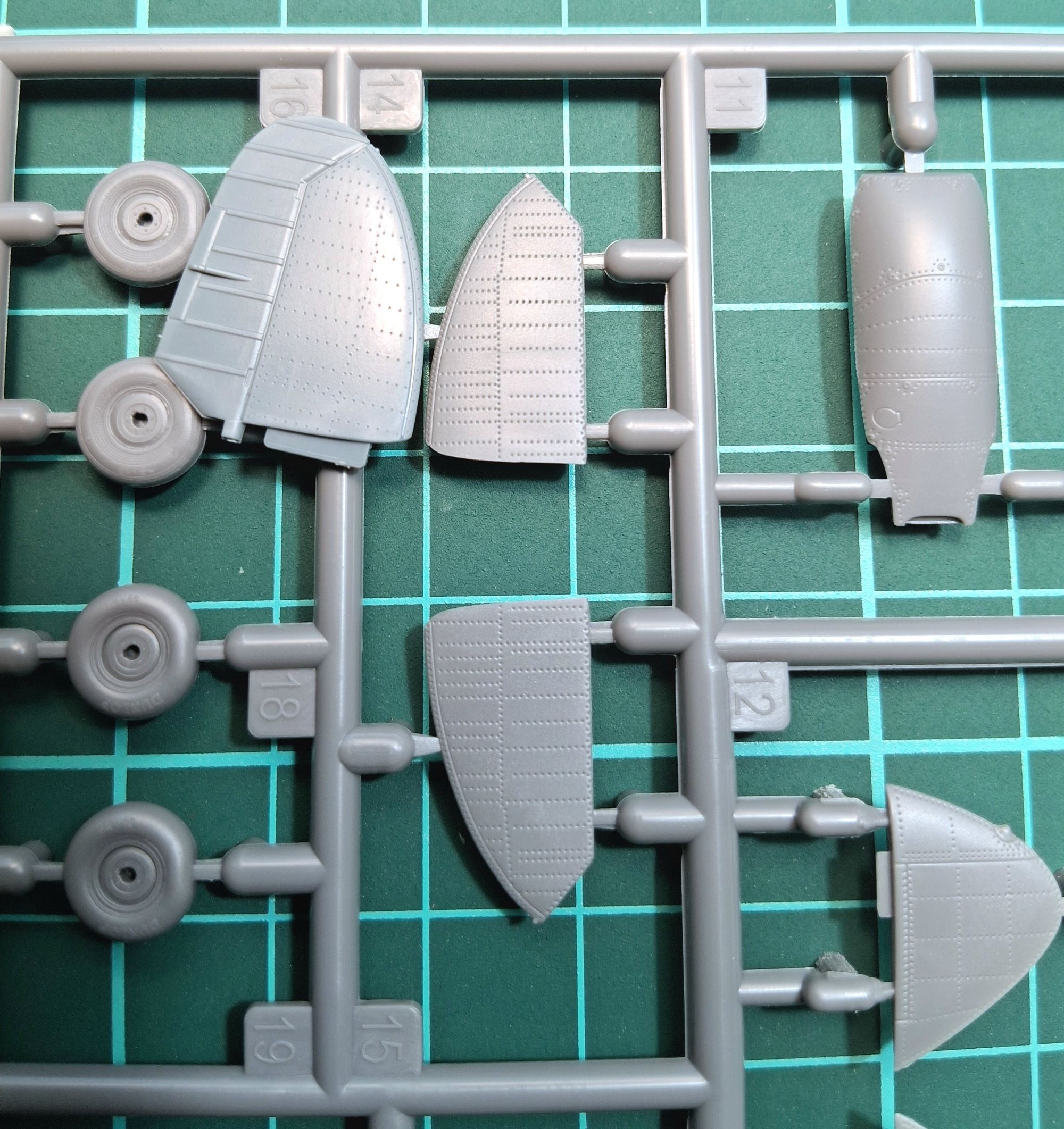 rámeček s čirými díly obsahuje řadu překrytů a variant čelních štítků, hlavní část je v pohodě mezi čirými díly jsou i dva typy GM-2 zaměřovačů, gyro zaměřovač, zkrácené oblouky křídla atp.