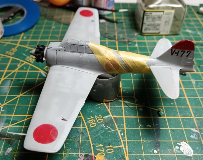 Mohu se zeptat, proč jsi se přiklonil k červenému vršku SOP? Totiž dekály Rising mají vršek červený, Eduard ve své čtvrtce A6M3 Type 32 (82213) černý. V popisu zmiňují i možnost červené, ale pravděpodobnější je podle nich černá. Jen se ptám, zda tedy nemáš ještě další podklad pro potvrzení zbarvení. Modrý šikmý pruh přes trup budeš ještě stříkat?