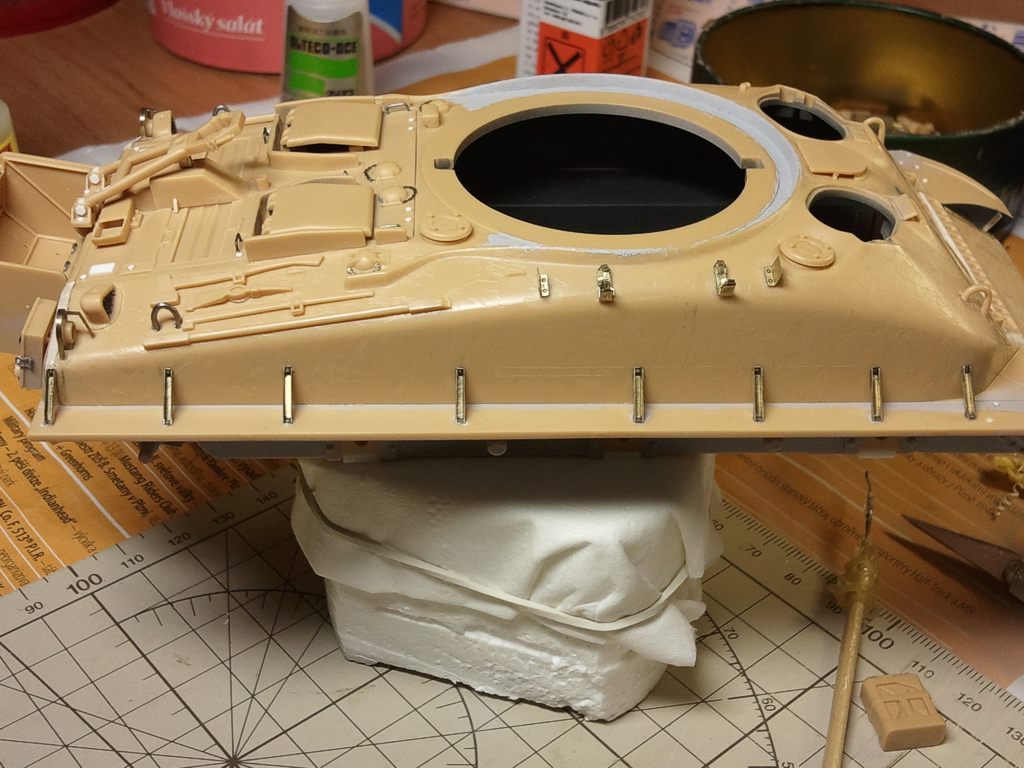 Díky Tome, snazim se..o:) ten pancir je v realu v pohode,,,fotky to hodne vytahly.,,jinak ohledne barvym uz mam jasno,,jen jsem to sem dal...aby to bylo kompletni do tedka,,,,mozna to nekomu pomuze..o:) jj je to mix tamek, odstinem do piskove, na kterou pak prijde jeste zeleny filtr, to mi vse poradil Braňo, z MF. Hodně se vyzná v izraelské technice....ted stale cekam na pasy, budu lepit drzaky blatniku z leptu a jine kraviny na horni cast tanku a tez musim zalakovat kola, udelat jim wash, hodit to na voziky a prilpit ke spodni vane..jeste je prace dost,,se stim seru, ja vim,,ale jsem uz takovy, mam rad detaily, co delaji model modelem..o:))