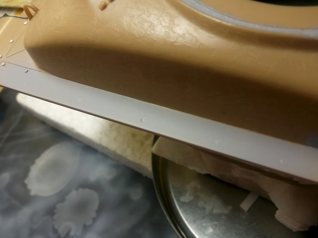 Takže další progres. Dnes jsem naohýbal a slepil z leptů držáky blatníků k vaně, dále jsem udělal držáky náhradních kol, ochrany peryskopů, ochrany světel a připravil hlaveň CAL 3O, která přijde do věže na levou stranu po směru jízdy tanku. Také jsem udělal kontrolní nástřik horní ch stran blatníku surfem, abych zjsitil, co bude a nebude vidět po tmelení plastem a sekundakem děr, které byli na původní plastové držáky blatníku. Jak vidíte, budu muset sem tam něco přetahnout jemně 5OO surfem či tmelem a jeste zbrousit. Pak už mám udělané a nalepené a začistěno ty dištance, kvůli zvednuti cca o 1,5 mm vozíků s koly, protože puvodně to bylo moc utopené,takže to bylo potřeba zvednout. Teď už je to v pořádku. A jako poslední jsem stříknul surfem podběhy blatníků, ktere jsem take tmelil a brousil. Přikládám foto.