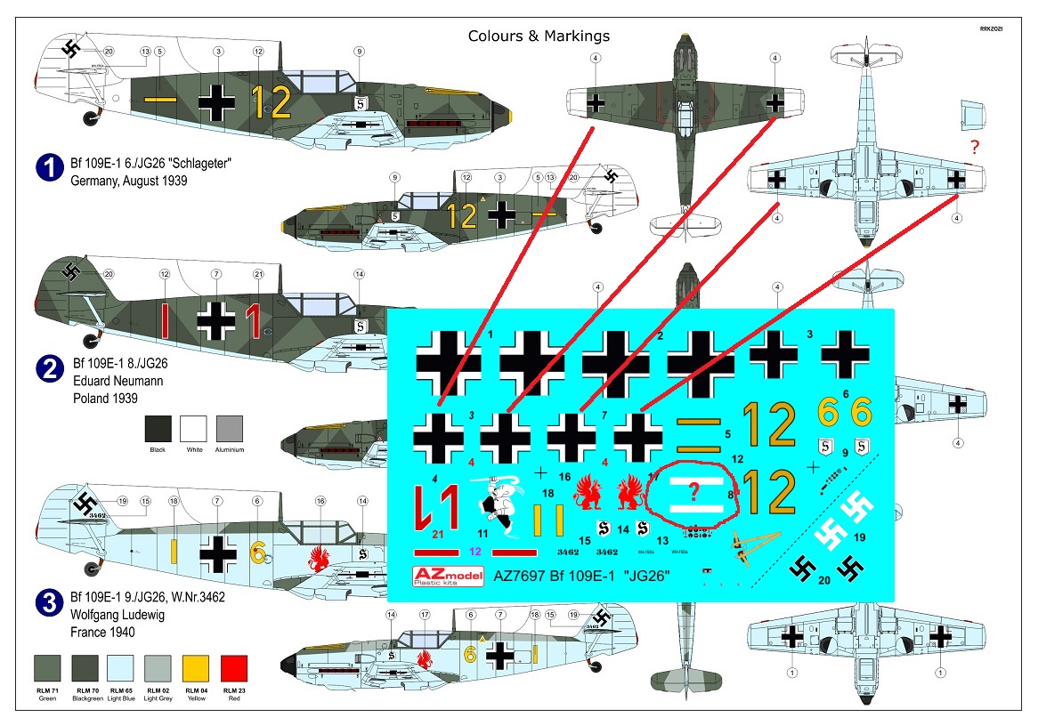 U krabičky JG26 se stala chyba u prvních dvou kamuflážích ve křížích na křídlech zvrchu a zespodu. V aršíku je jiný typ než tam má být. Musel jsem improvizovat a použít kříže z kamufláže č.3. Bohužel ty originály jsou atypické znaky, takže jdou blbě nahradit ze zásob.