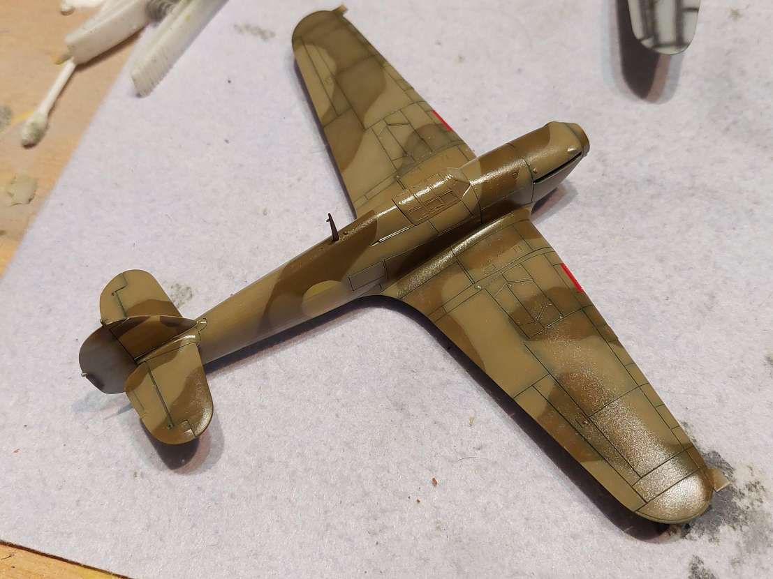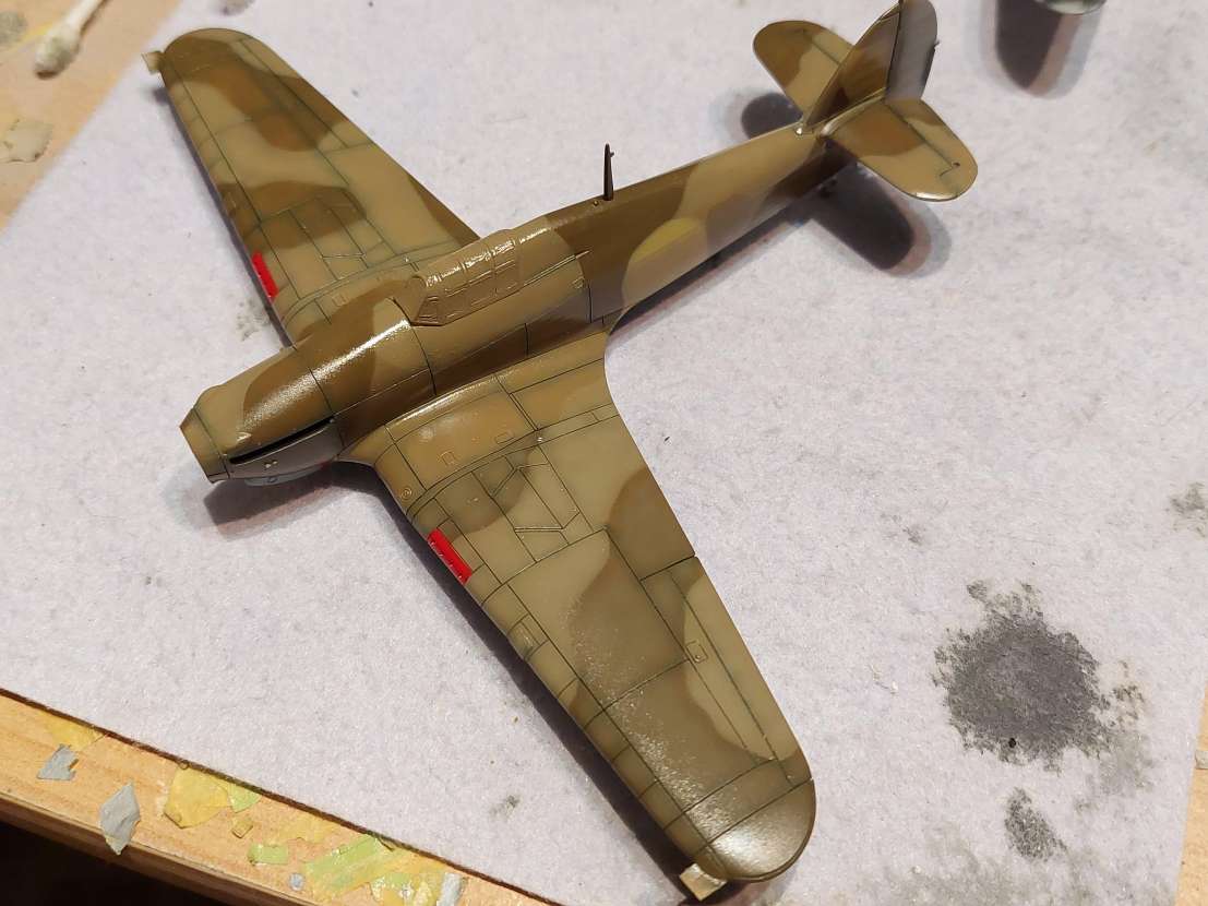 V barvě. Vím, nástřik takto působí hrubě, trochu opravdu je ale po obtiscích a laku to chci trochu srazit jemným smirkem. Základ jsou odstíny agamy. Co je v návodu dané jako "fresh" jsou odstíny MRP. Levé křídlo má být "faded", použity agamy zesvětlené odstínem spodku. Na spodku je agamácká RLM76, ošustělé levé křídlo je tamka XF23 lehce přefouknutá RLM76.