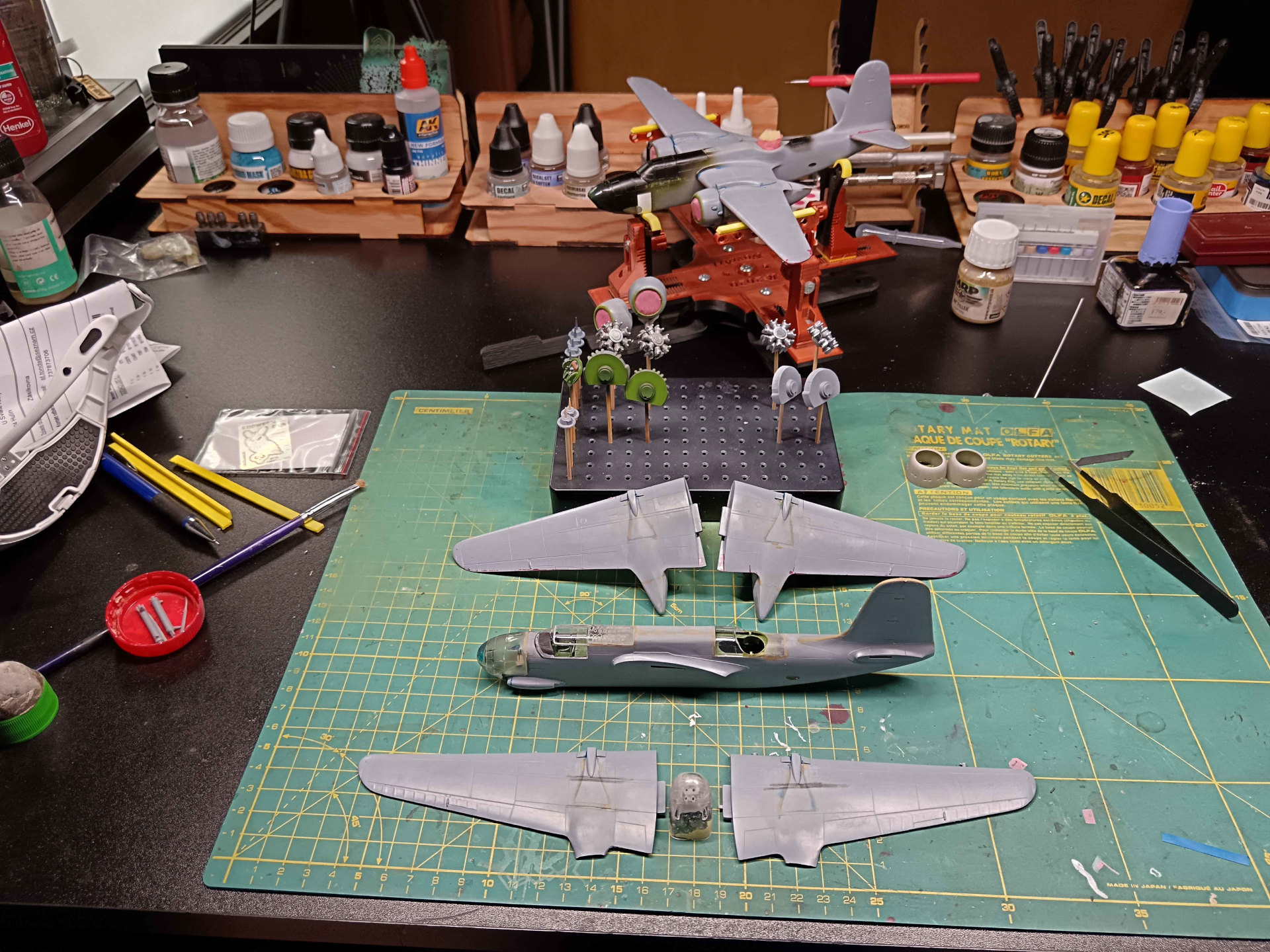 Dorytý vrchy křídel u UTK-1 a DB-7B + 12g olova v čumáku a navrtaný díry pro 4 kulomety