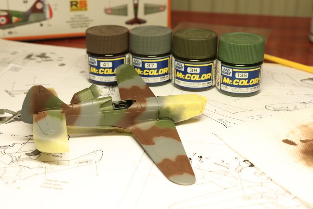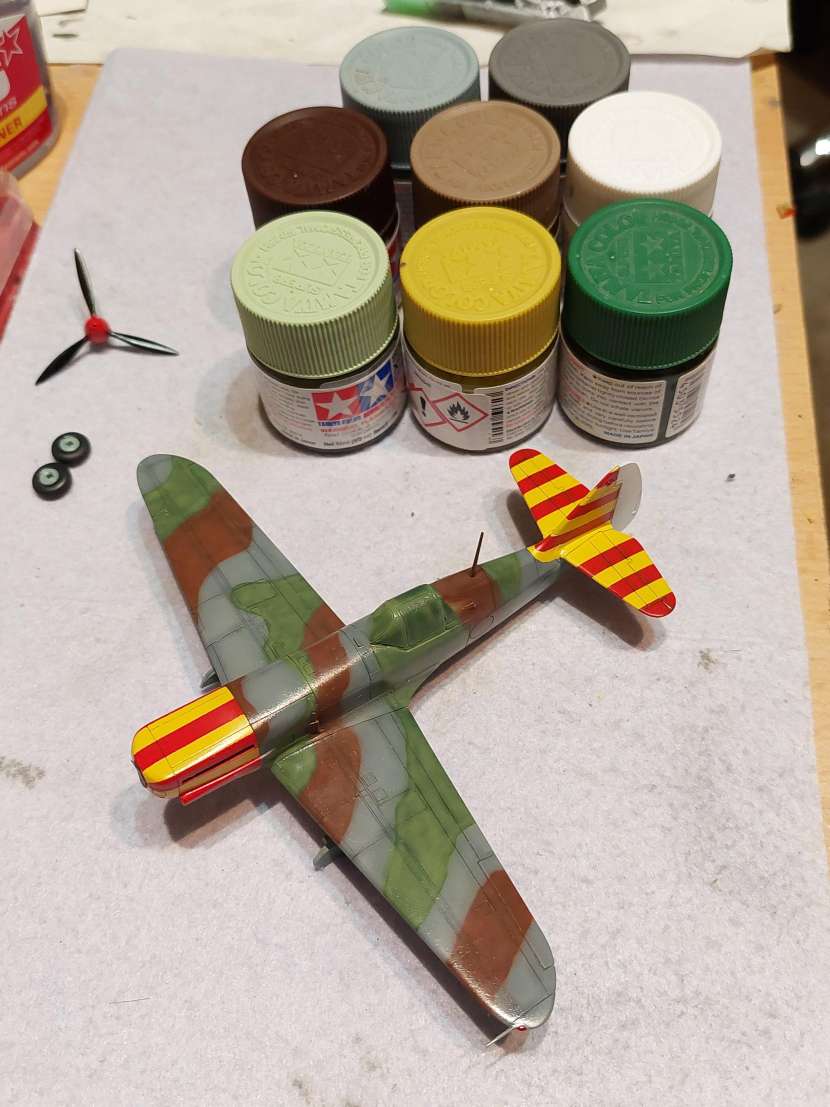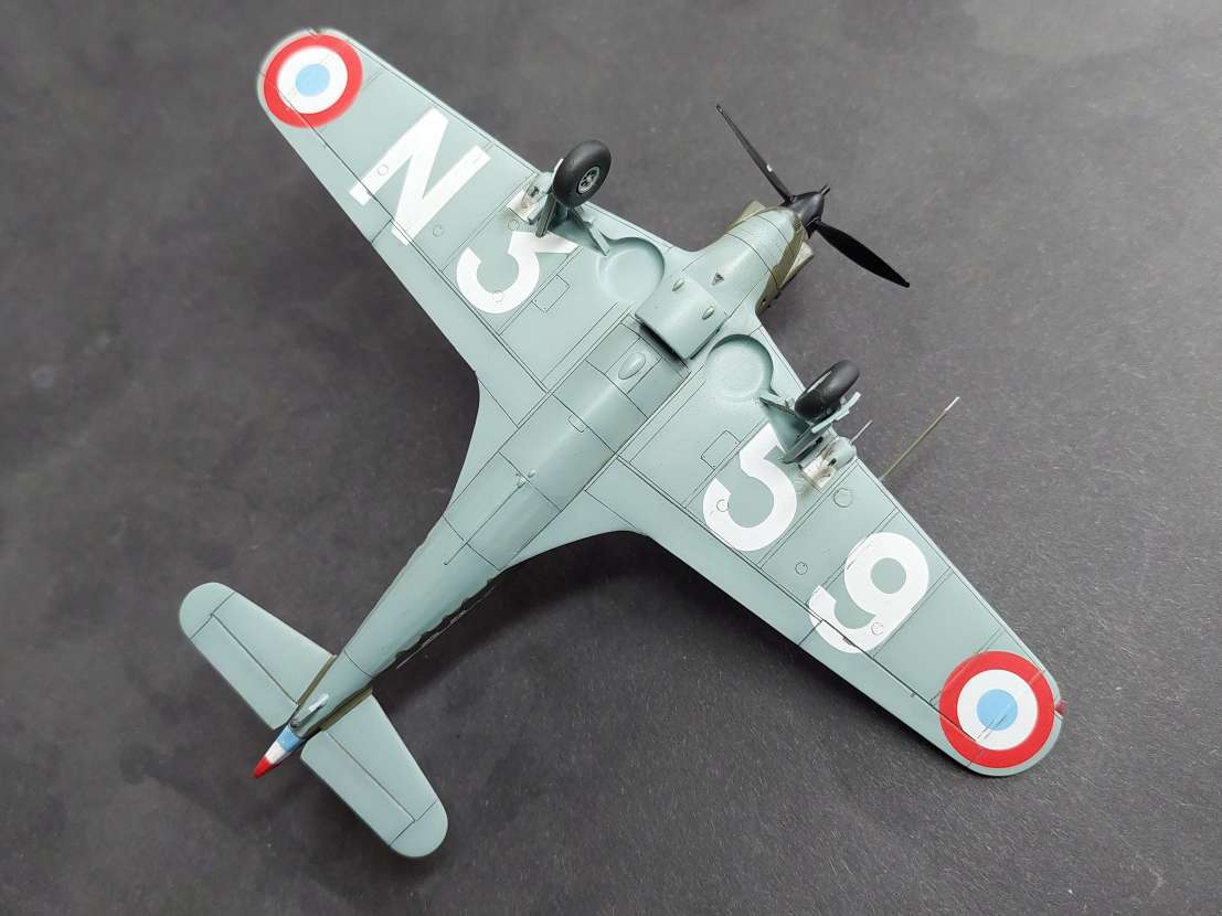 Nebaví mě wash, tak jsem se z Hurricana vrátil sem. Laborovalo se nad odstíny. U Morana jsem vzal návod H2000 a použil britskou zelenou, no na stroj z Alžírska se hodilo něco trochu světlejšího. Ale nějak mi to nešlo do kombinace se zbytkem barev pro trojbarevku. Takže u D.520 jsem dlouho uvažoval, potřebný mix který udává Dora u MB.152 jsem doma neměl. Vzpomněl jsem si na lihovou agamu, "autentický" odstíny pro Francii. No sotva jsem nafoukal první kamuflážní pole, letěla barva zpátky do lahvičky, něco tak jedovatýho bych použil možná tak na bronzovou střechu kostela nebo vyblitou Mi-4 z Vyškova. Tak jsem nakonec vzal něco zelenějšího od gunze a výsledek je na fotce. Je to takové asi taky mimo, takové živé, ale už to nechám.