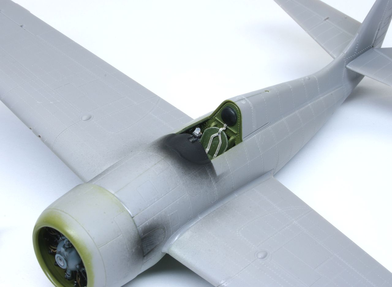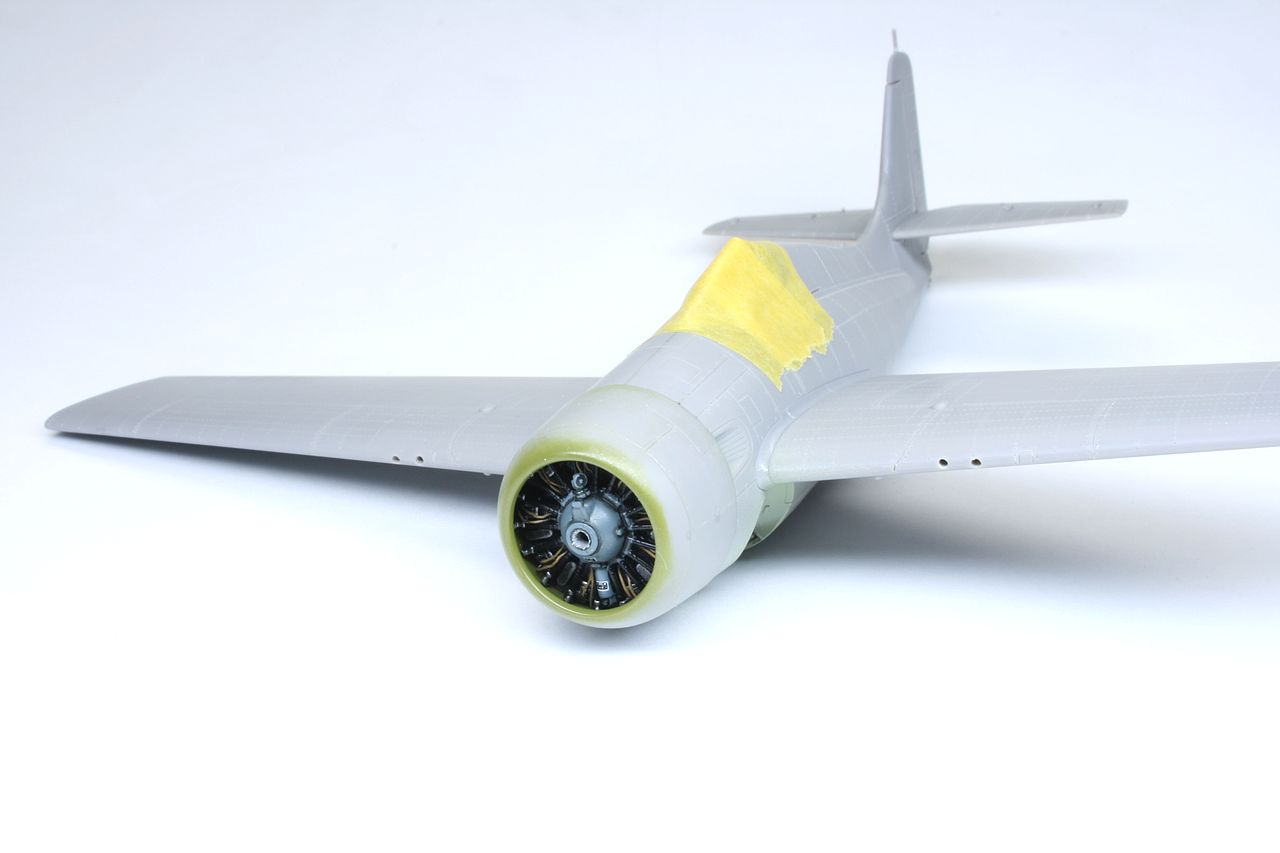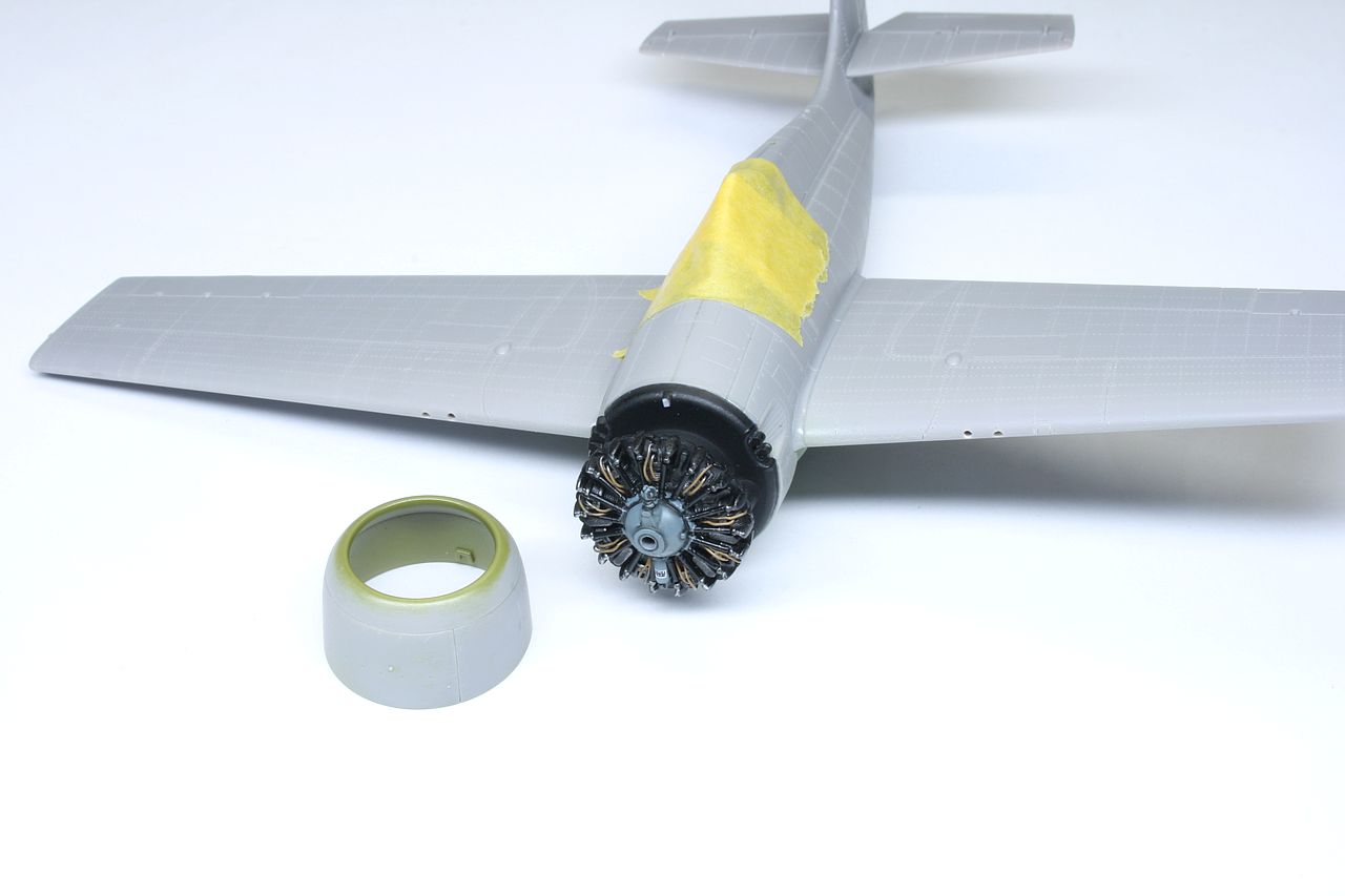Také beru zpět ten kryt motoru. Finální lícování odhalilo, že je přeci jen ta spára věrší než by měla být. Já jsem na válce vůbec nesahal, ale před finálním přilepením jsem ubral skalpelem materiál na trnu na motorové přepážce (na který se lepí motor) a samotný motor se tím dostal víc dozadu. Pak to sedlo opravdu hezky.