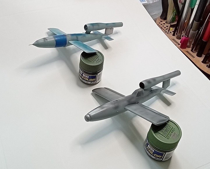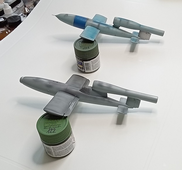 Po shlédnutí hotové V-1 1:72 (zde na KF) jsem si vzpomněl, že někde pod stolem musí být rozdělaná 1:48 Tamiya s lepty Eduard, u které jsem odstraňoval její největší vadu a to příliš vysoký pylon a následně z toho vyplývající i vysoká SOP. Takže úprava - snížení o 2,9mm. Pak se mi narodila dcera, potom druhá a já modýlky na čas (20 let) odložil. Stejně se mi tehdy nelíbila kamo v modelu... Při hledání jsem našel ještě rozdělanou pilotovanou variantu RE 4a 1:48 MPM a nyní tedy nastal čas na dokončení. Kamufláže si, s dovolením, převezmu z modelů HpH a PprofiModeller 1:32. Na modelech je vidět snaha o předšejding pistolkou Testors s plastovou tryskou 0,5mm (šedá) a kompem Speedy.