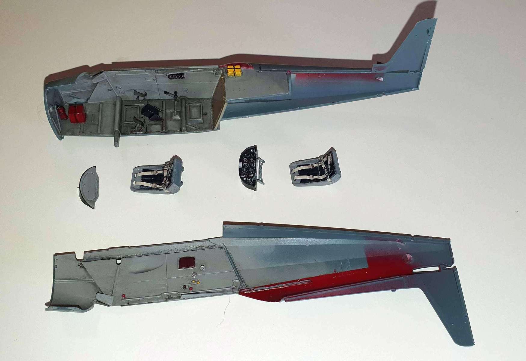 Za víkend hrubá stavba hotova. U Bezáka jsem se rozhodl nalepit motor a podvozky až po nabarvení - podvozky proto, že by se mi blbě maskoval a stříkal modrý proužek, motor jednak proto, aby se mi jednodušeji maskoval, druhak proto, abych mohl dát výfuky až do nabarveného motoru (snad se mi to tou dírkou vzadu povede).