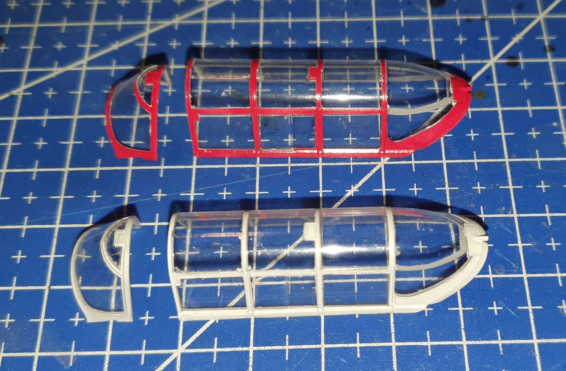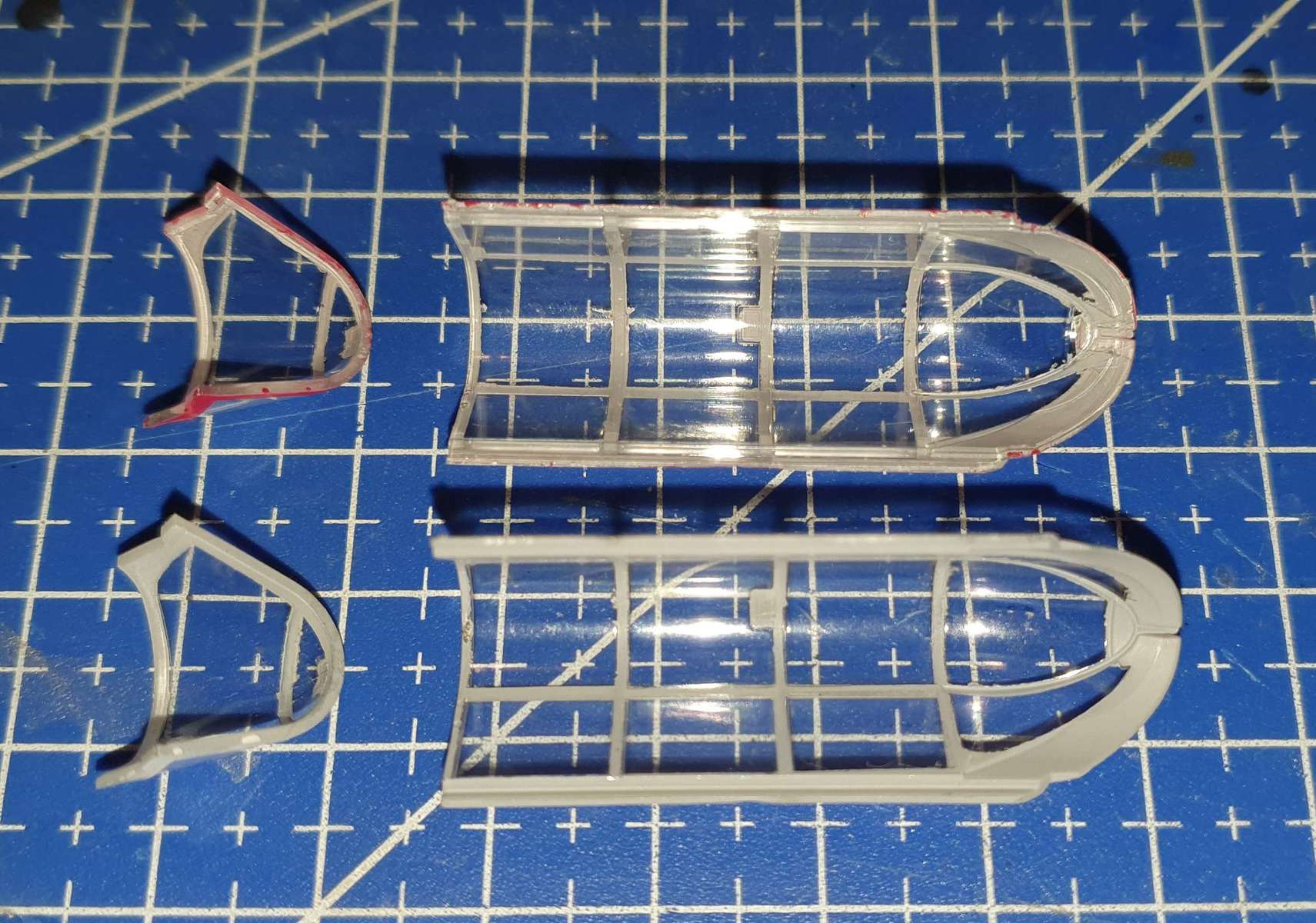 Kabinky - je třeba udělat zevnitř zadní části překrytu dvě šprušle (návod na to neupozorňuje). Šprušle jsou zevnitř naznačeny rytím.