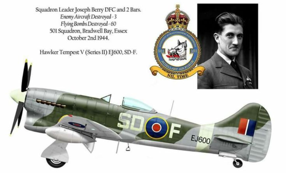 S/Ldr Joseph "Joe" Berry, DFC & 2 Bars - anglický stíhací pilot a nejúspěšnější ničitel létajících bomb 2. sv. v. se 3 zničenými letadly a 59 samostatně a 1 sdíleně zničenými bombami V-1