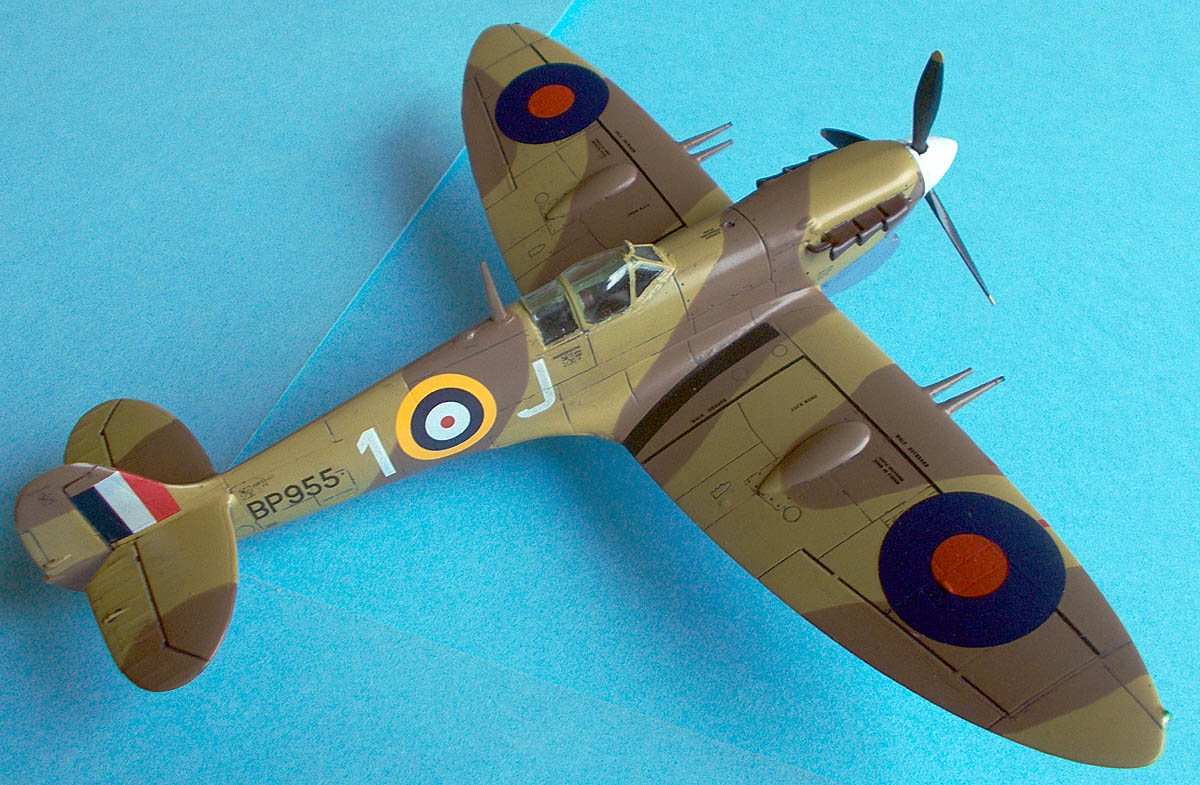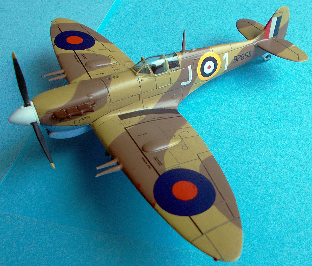 Spitfire Mk. Vc, BP955, J-1, 601. Sq., RAF, základna Luga, duben 1942. Tento letoun byl na Maltu dopraven 20. dubna na palubě letadlové lodě Wasp v rámci operace Calendar. Letoun používal Flt. Lt. Denis Barnham který byl velitelem letky u 601. Perutě. 21. Dubna sestřelil Ju 88 a poškodil Bf 109, ale nakonec byl nucen nouzově přistát kvůli přímému zásahu motoru. Na konci války měl na kontě 5 sestřelů, 1 sdílený 1 pravděpodobný a 1 poškozený letoun. Letoun nesl standardní středomořskou kamufláž. Vnitřní kanony byly vymontované, zůstaly po nich jen kryty.