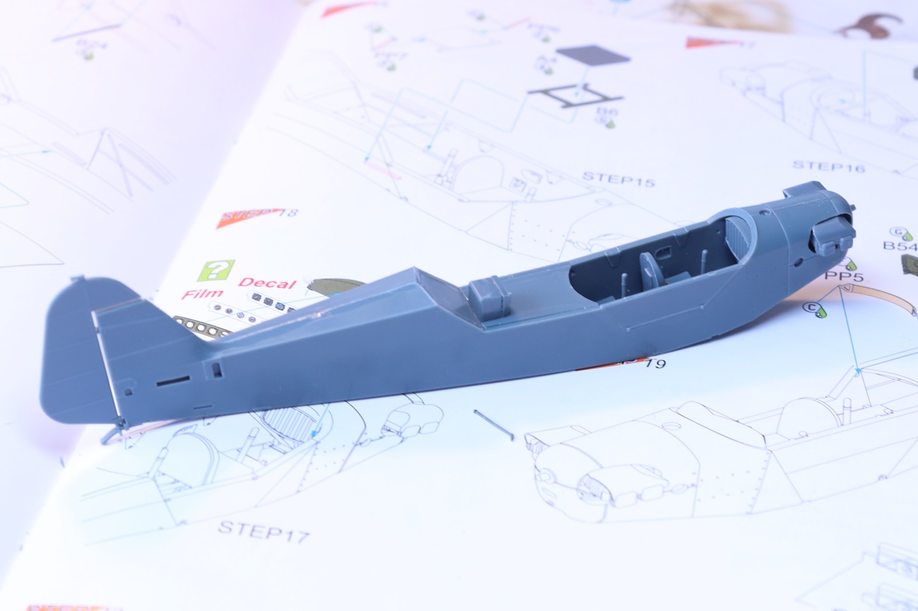 Zatím vše pasuje jak má. Trochu jsem bojoval s motorem. Vepředu mi nešel zavřít trup. Nějak jsem to vyřešil ani už nevím jak, ale něco jsem tam pokrájel. Jinak si myslím, že jak psal Libor, tak ten model se bude muset lepit a stříkat jako model auta a motorky. Protože ty křídla by ten jeden nosník neudržel pokud se s tím bude manipulovat. Jako v realitě je to jiná nosnost než na modelu v plastu. A ty křídla vypadají masivně a asi budou něco vážit.