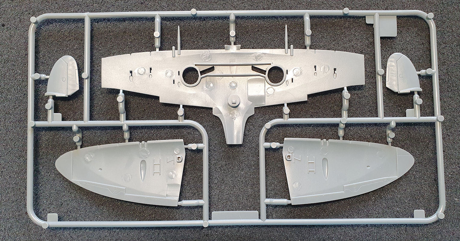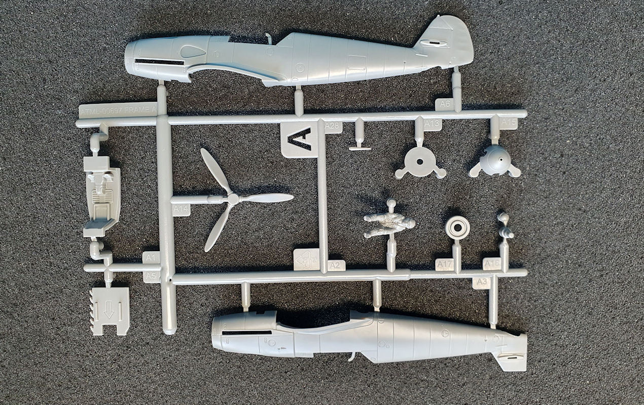 Jinak je řešen kryt motoru odstříknutý i s výfuky a chybí pár detailů nebo drobných dílů jako třeba pitotka. Podvozkové nohy jsou vcelku s kryty a vrtule je dohromady s listy.