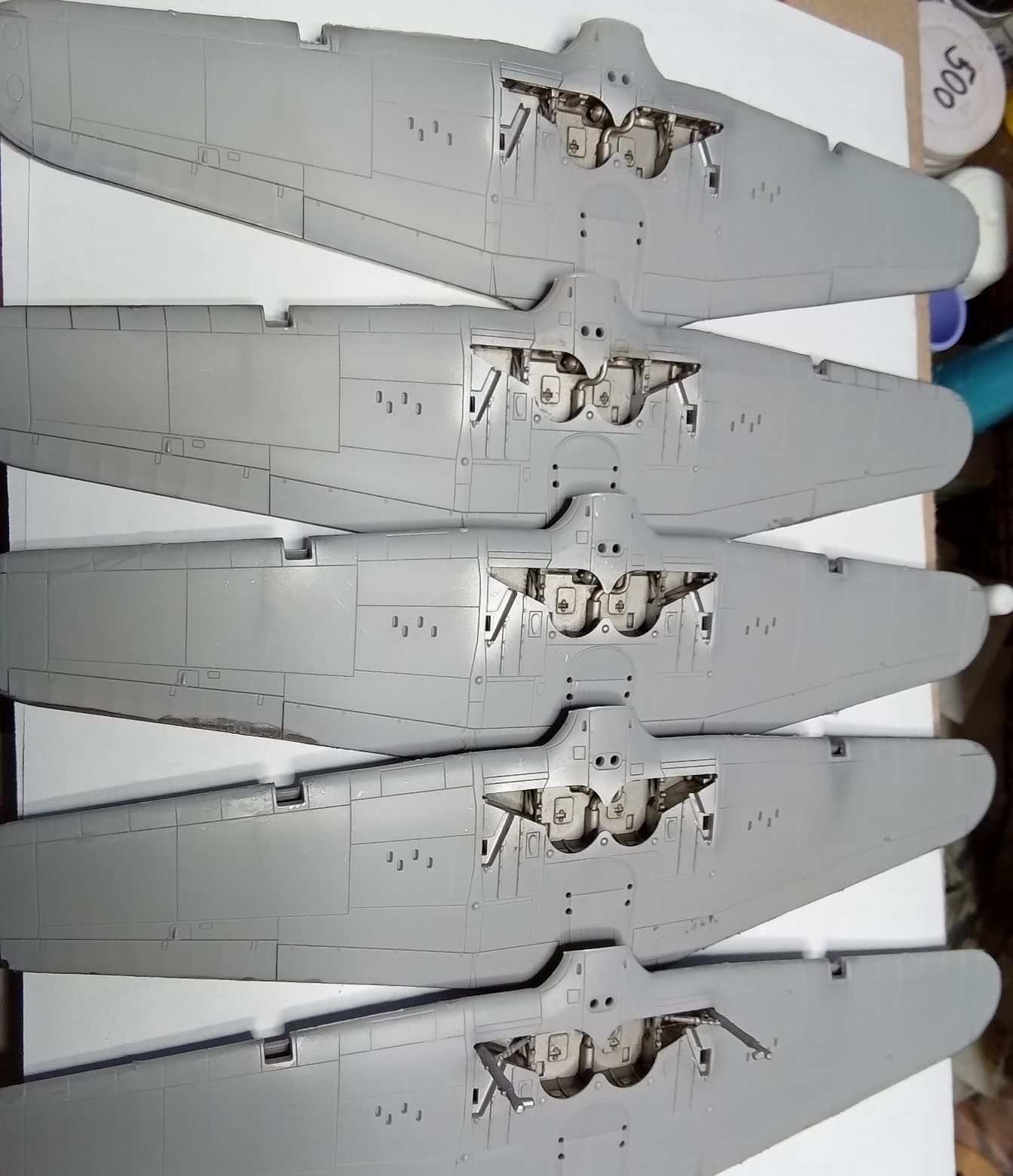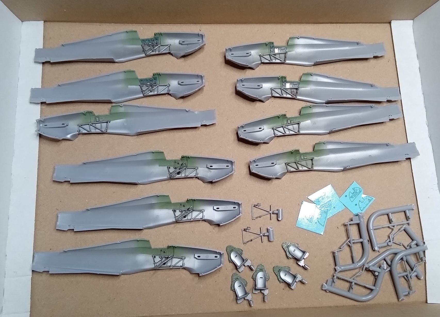 Tak jsem také zaříznul. Vzhledem k počtu kusů mi to nepůjde tak rychle. Doplnil jsem jen hadici, která je fotkách dobře vidět. Ještě jsem stihnul křídla a díly kokpitů stříbrnou C008. Nejspodnější křídlo má zalepené podvozkové nohy dle návodu, u zbývajících si osvěžím dovednost z dětských let - Když natočíš nejdelší osten ježka v kleci ... . :-D