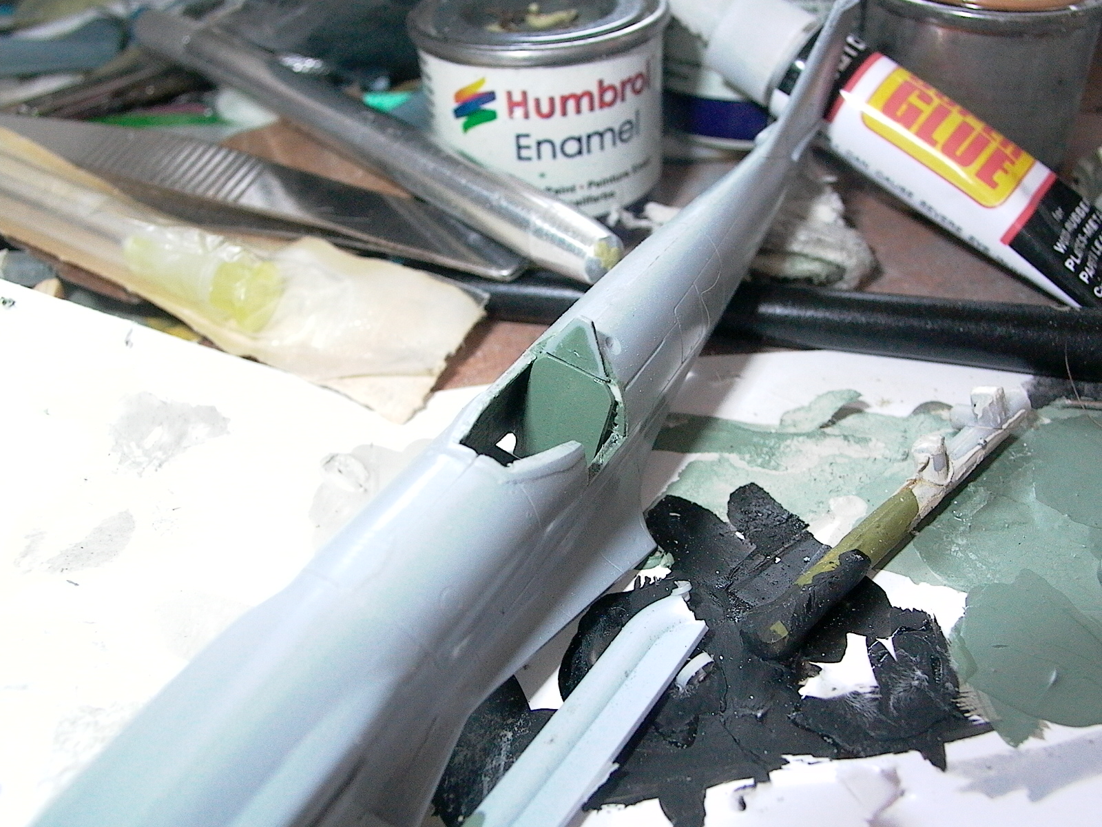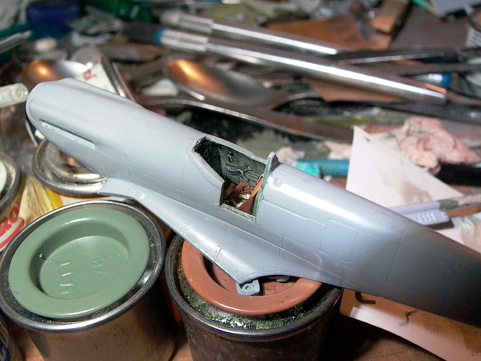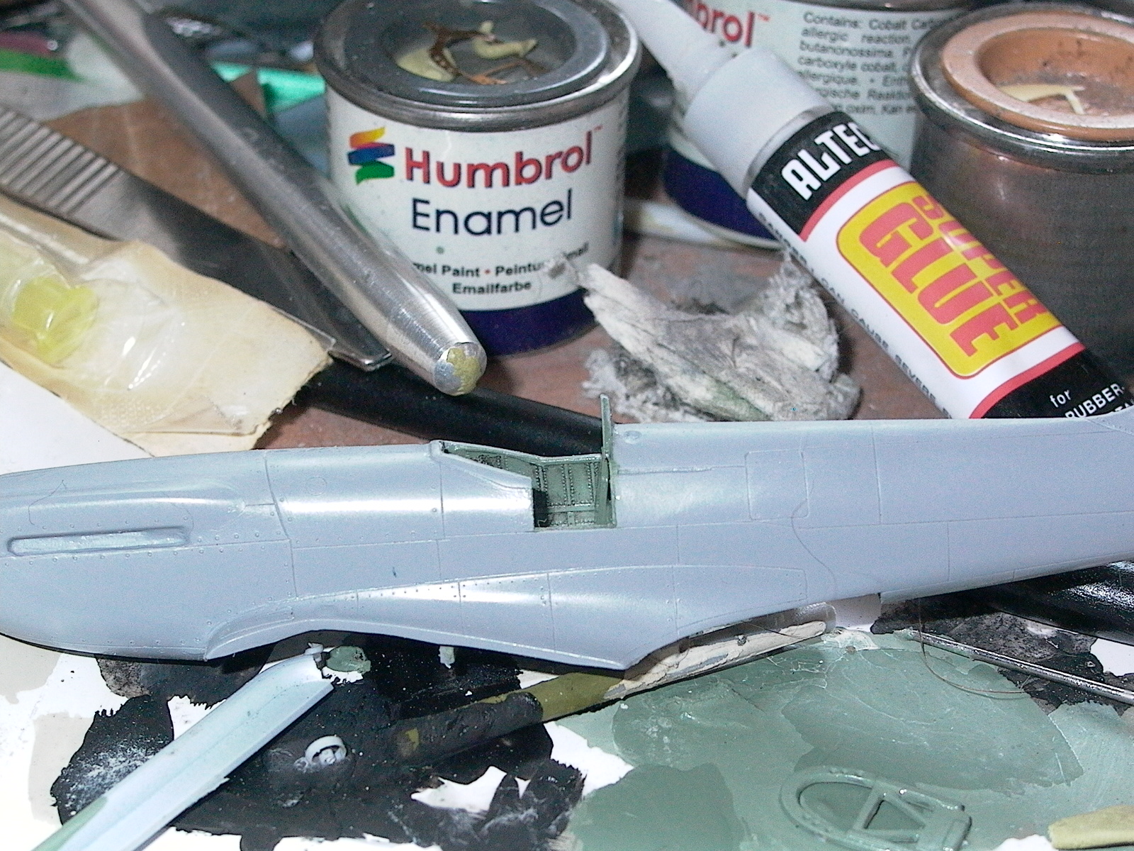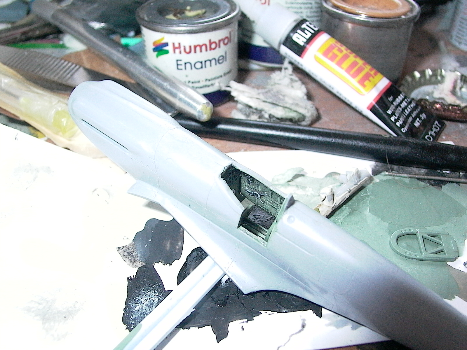 Co vidím jako problém, je zadní přepážka kokpitu.Je úzká, trochu moc zjednodušená, a jak to tak vypadá, asi budu muset zkusit vystříhnout novou z plechu (od piva), protože do prostoru pro ní zasahuje reliéf boku kokpitu, bohužel tak nešikovně, že má snahu sklouznout. Lept na XVI nebo XIV.e asi neexistuje. Tak to dopadá, když jeden nepromyšleně otevře kokpit...