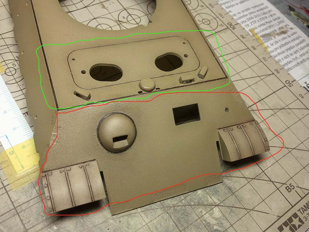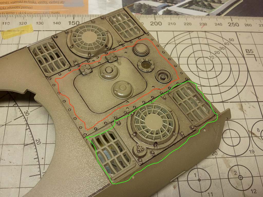 Tak jsem zakoupil enamelove washe od SIRAHOBBY a vyzkousel je. Na fotkach vidite vysledek po pouziti poustniho(do hneda) a tmaveho washe( cerny). Dela se nim dobre,,staci dobre prokarbovat lahvicku a pak na leskly nebo na polomatny povrch nanest na mista kam potrebujeme spicatym stetce a necham chvilku zasnout. Pokud trosku vytecou ci zatecou jinam, tak stetcem namocenym v redidle (white spirit nebo enamalove redidlo od Tamky) se dobre setrou.Huste jsou dost, daji se i naredit, pokud potrebujeme vytvorit slabsi efekt. Na zelene oznacene plochy jsem jako podklad pouzil leskly lak Sidolux a na cervene pololesk ze Sidoluxu a matne baze Tamiya), z obou povrchu to slo dobre stetcem namocenem v redidle ocistit.Takze doporucuji.